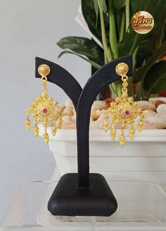 ทองเหลือง ต่างหูพิกุลพร้อมฝังเพชร ลายโบราณ