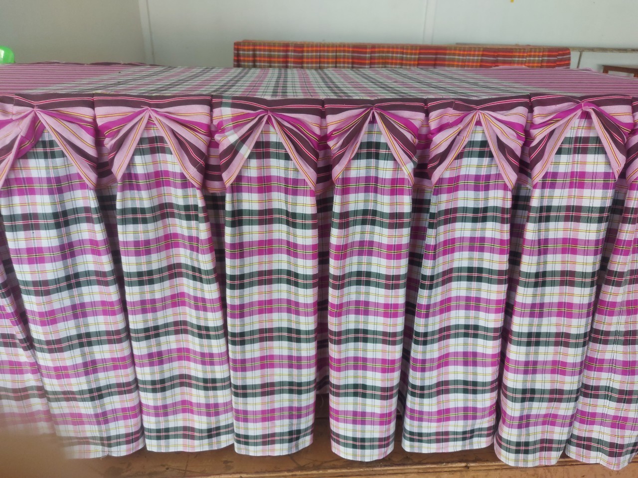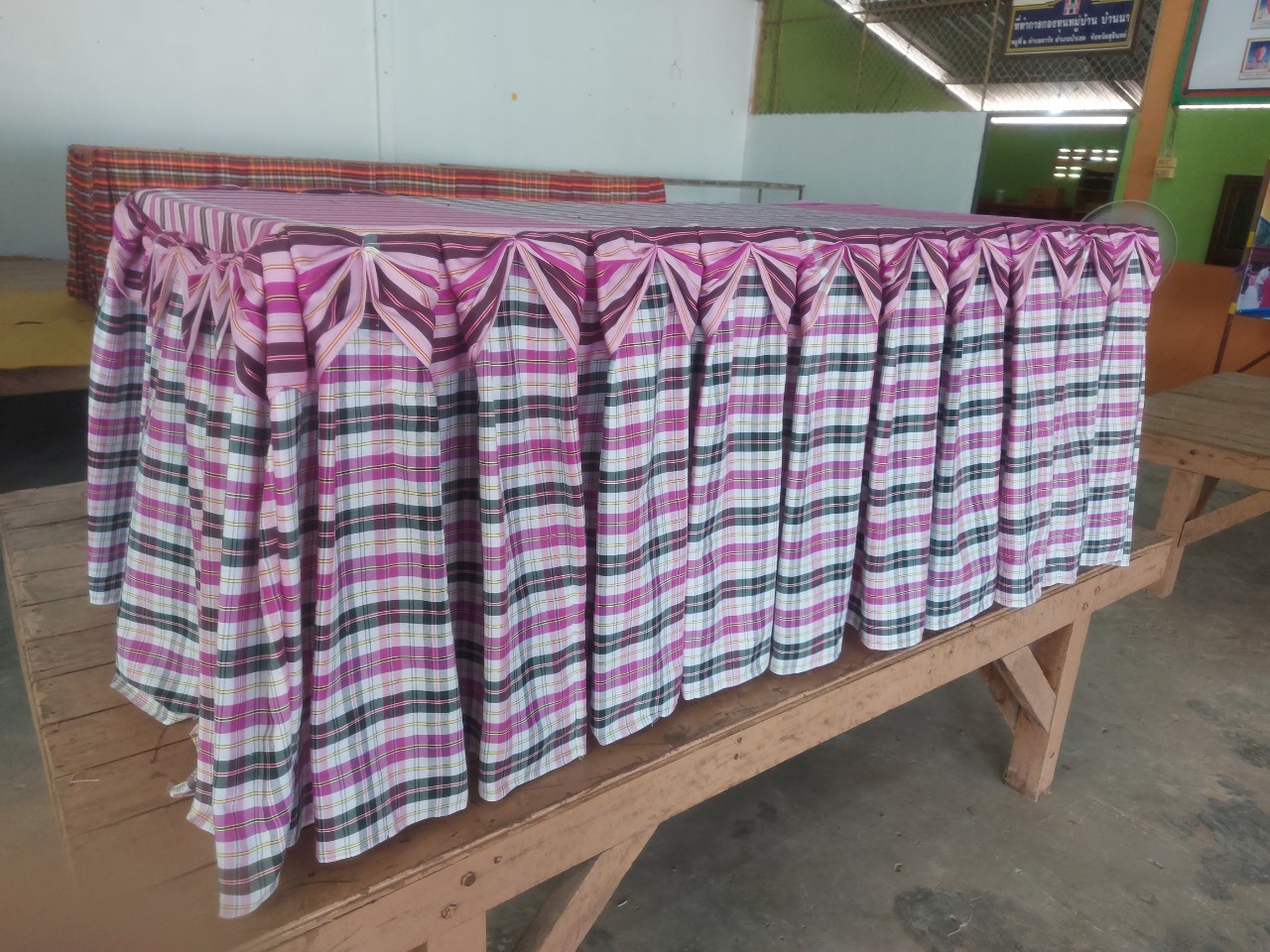 ผ้าคลุมโต๊ะ จับระบายสำเร็จรูป ตัดเย็บจากผ้าพื้นเมือง โดยฝีมือสตรีบ้านนา ตำบลตาวัง อำเภอบัวเชด จังหวัดสรุินทร์