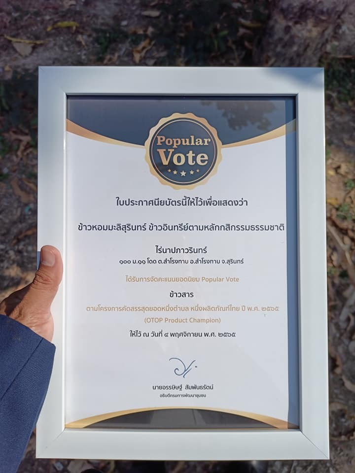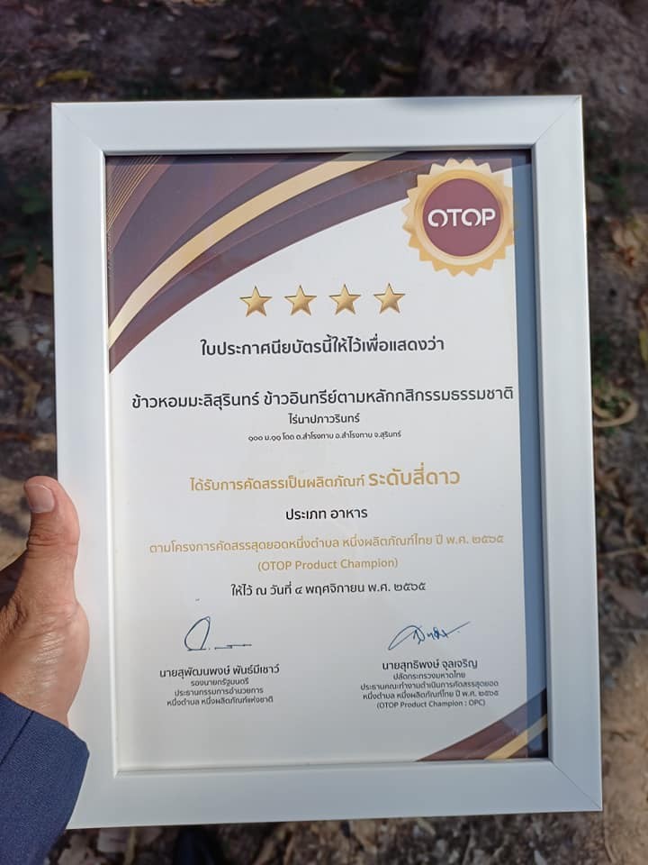 ผู้ผลิตและจำหน่าย “ข้าวหอมมะลิสุรินทร์” ข้าวอินทรีย์ เกษตรปราณีต ทำด้วยมือทุกขั้นตอนการผลิต การันตีรางวัล OTOP ระดับ "สี่ดาว" ประเภทอาหาร และรางวัล "Popular Vote" ข้าวสาร ในงานคัดสรรสุดยอด หนึ่งตำบล หนึ่งผลิตภัณฑ์ไทย ระดับประเทศ ปี 2565 “พิถีพิถันการปลูกตามหลักกสิกรรมธรรมชาติ คือ หลักการพื้นฐานในการจัดการดิน น้ำ ป่า และทรัพยากรธรรมชาติ ให้ผลผลิตที่มีความหอมกลิ่นใบเตยที่เป็นเอกลักษณ์เฉพาะตัว เมล็ดขาวใส เป็นเงาเคลือบมันและอุดมไปด้วยสารอาหารนานาชนิด สามารถติดตามข้อมูลข่าวสารเพิ่มเติมได้ที่ Facebook Fanpage : ไร่นาปภาวรินทร์