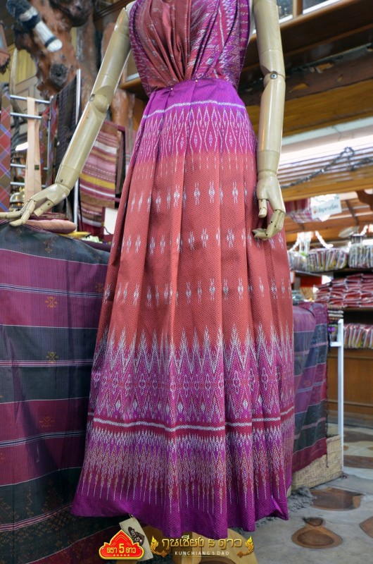 ผ้าไหมสุรินทร์มัดหมี่ลายดอกมะเขือ เชิงโทนสีม่วง ท้องผ้าโทนสีชมพูแสด รูปแบบการทอ 6 ตะกอ ยกดอกลูกแก้ว