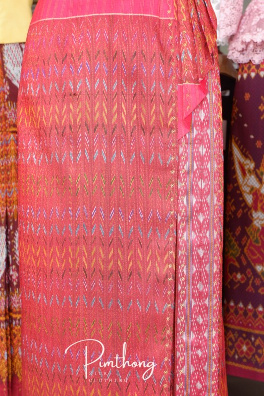 ผ้าถุงไหมแท้ทอมือมัดหมี่ ลายโฮลตีนแดง(เชิงแดง) ตัดสำเร็จพร้อมใส่ ใช้ผ้าไหมในการตัดเต็มชิ้น