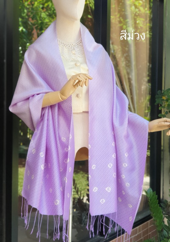 ผ้าไหมคลุมไหล่งานทอมือ 6 ตะกอ ยกดอกลายลูกแก้ว งานสไลด์สีและมัดย้อม ขนาด 65×200 ซม.