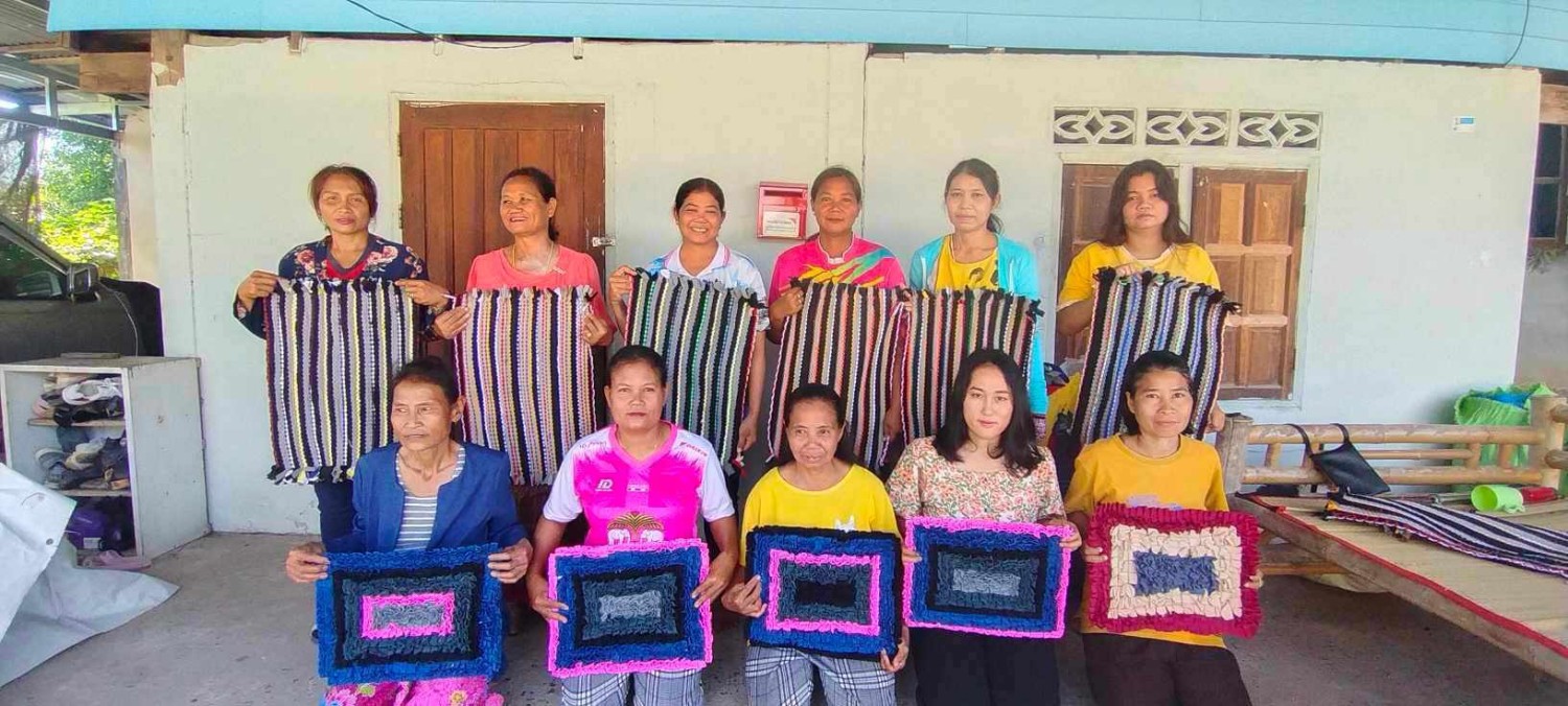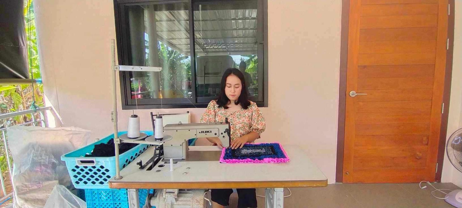 พรมเช็ดเท้าทอผืนละ25บาท และพรมเช็ดเท้าเย็บผืนละ39บาท 16*22cm มีหลากหลายสี ประดิษฐ์จากเศษผ้าเหลือใช้