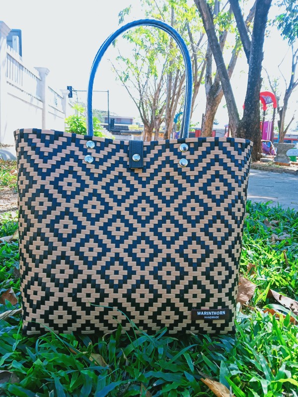 กระเป๋าสาน สานจากเส้นพลาสติกรีไซเคิล สวย ทนทาน น้ำหนักเบา ขนาด10*10นิ้ว