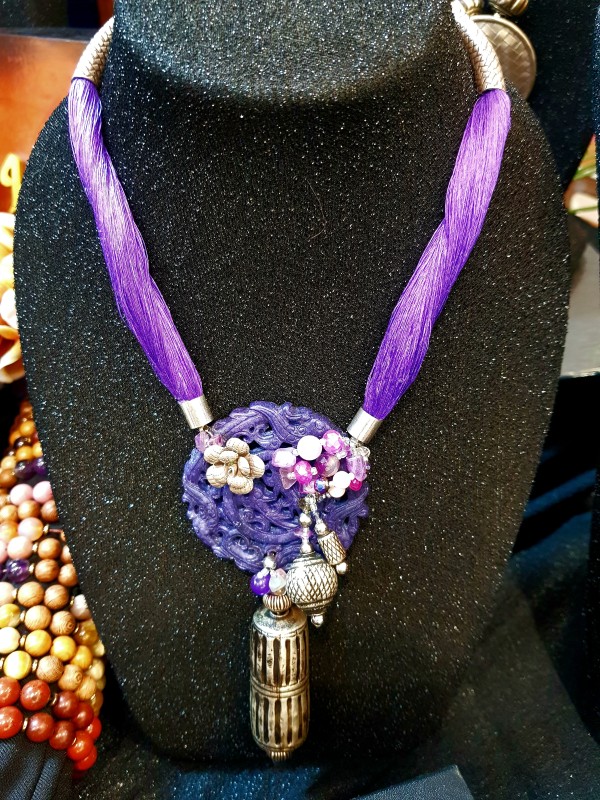 สร้อยไหมจี้หยก ทำจากเส้นไหมแต่งด้วยเงินและจี้หยก