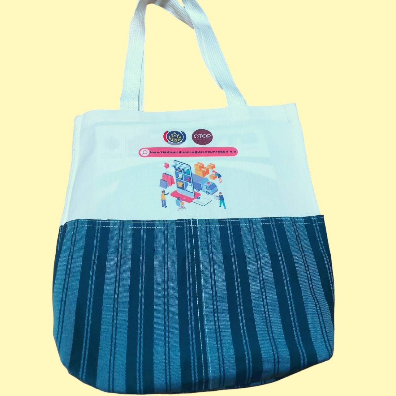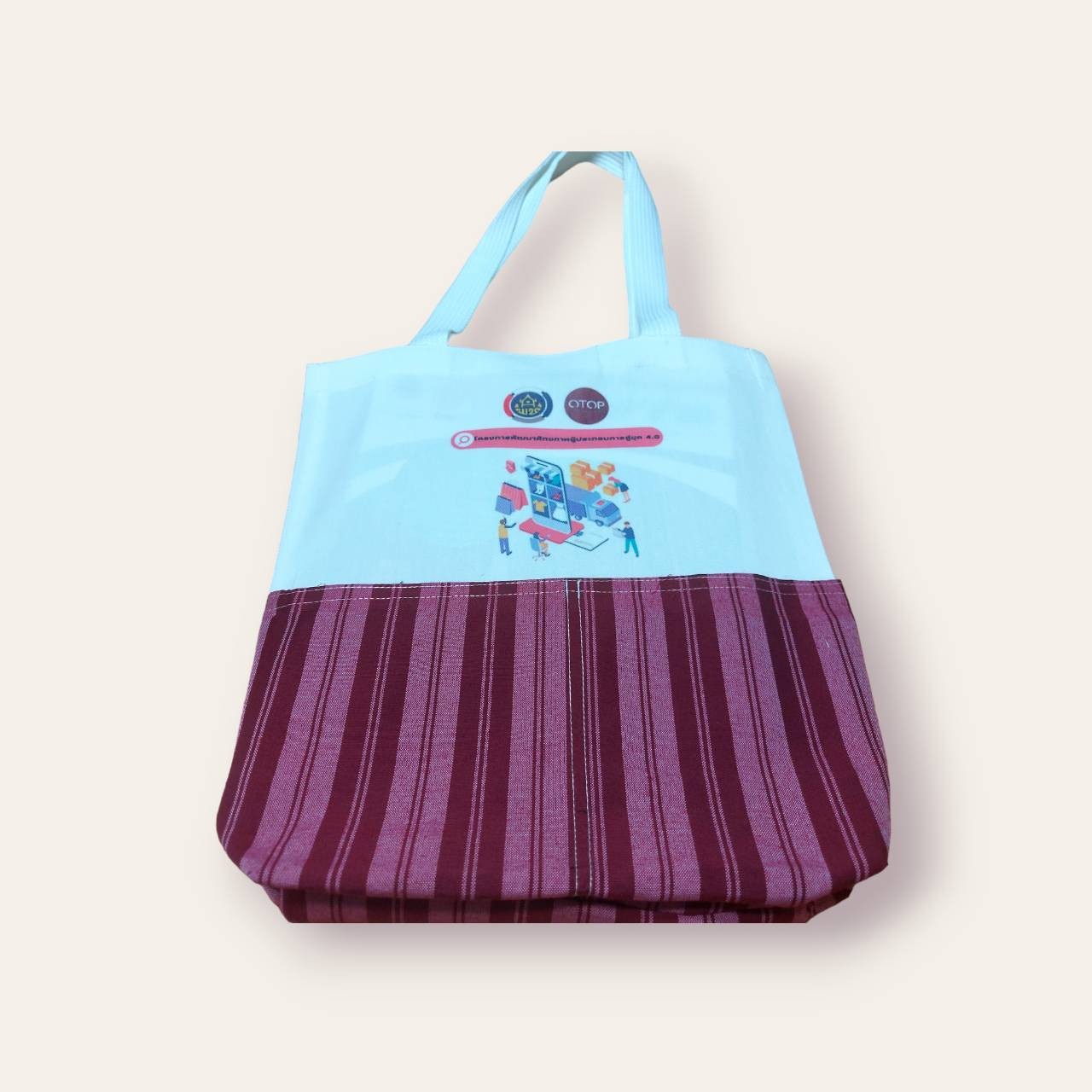 กระเป๋าผ้า ใส่เอกสารโครงการอบรม แต่งลายผ้าขาวม้า ตัดเย็บฝีมือปราณีต ออกแบบพร้อมสกรีนโลโก้ 0817097453