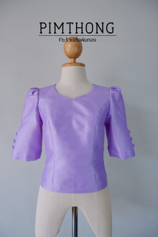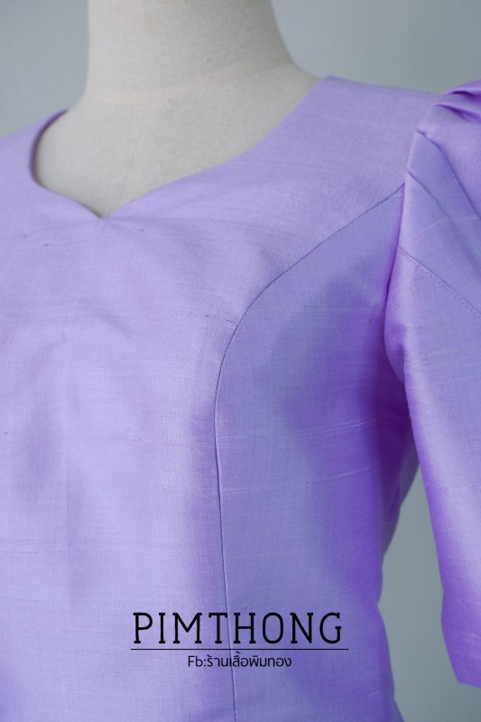 เสื้อผ้าไหมบ้าน สีม่วงดอกรัก ตัวเสื้อเป็นคอรูปหัวใจ ไหล่ยก แขนจีบแต่งกระดุม 3 เม็ด