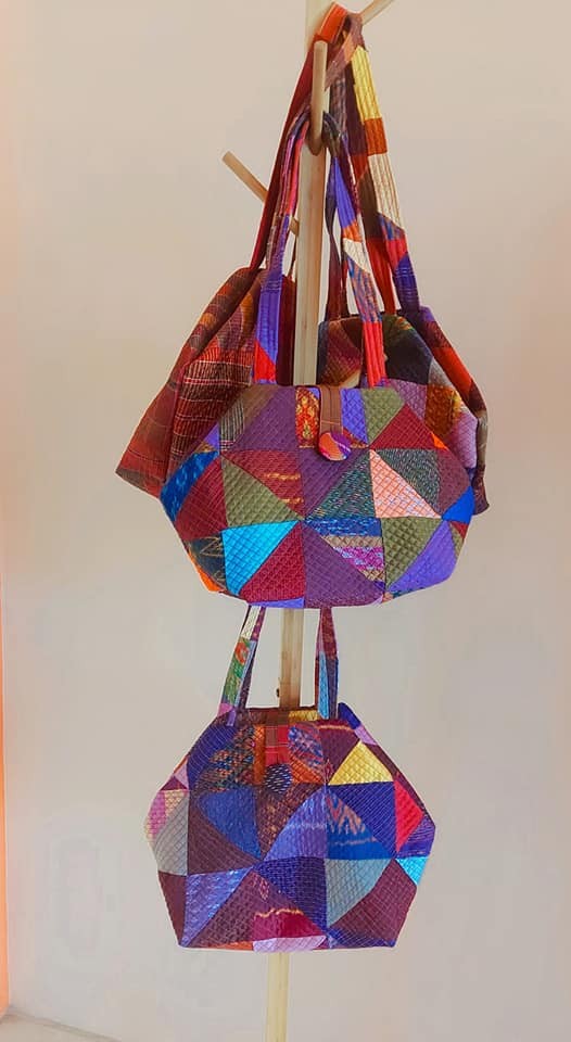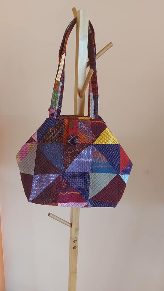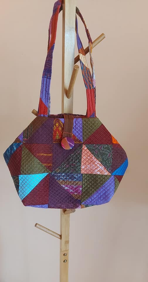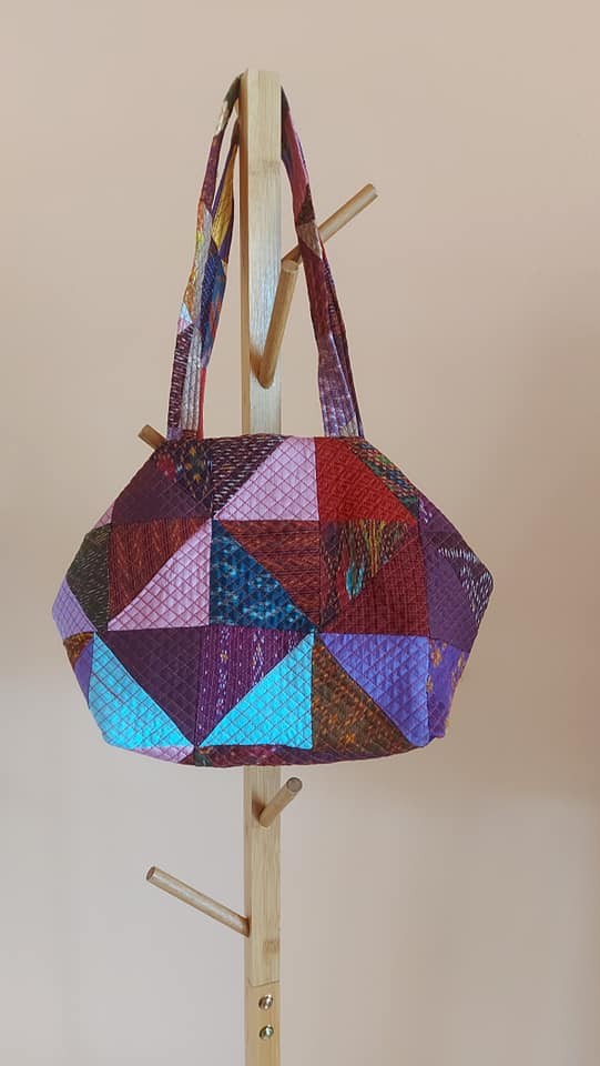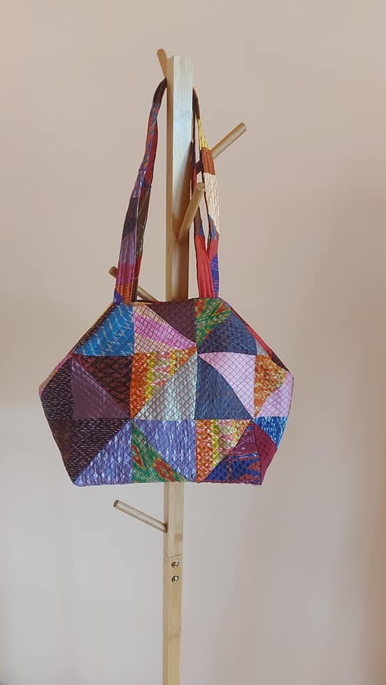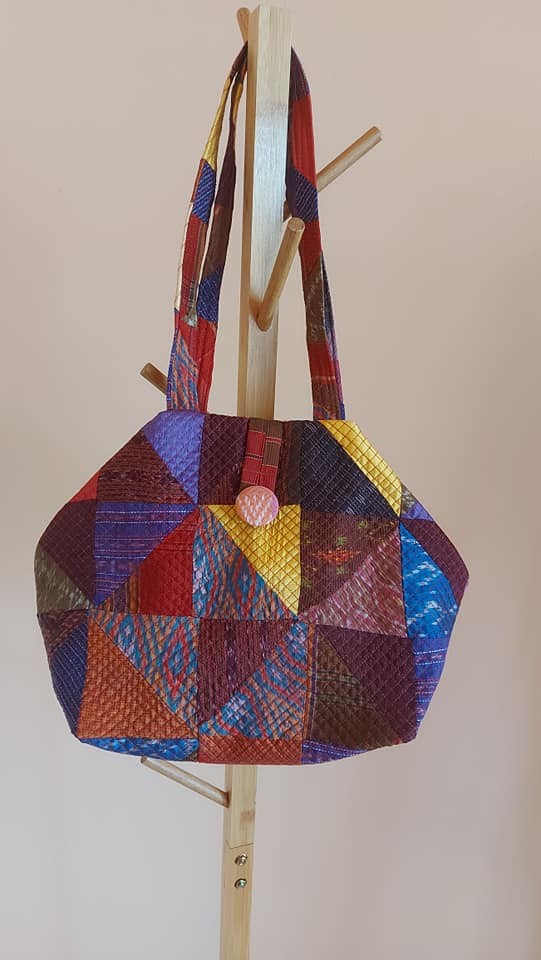 กระเป๋าผ้าไหมแท้ งานตัดต่อลาย ออกแบบมีดีไซน์ ตัดเย็บฝีมือประณีต มีซิปมีซับ และช่องใส่ของด้านในใส่ได้จุใจ