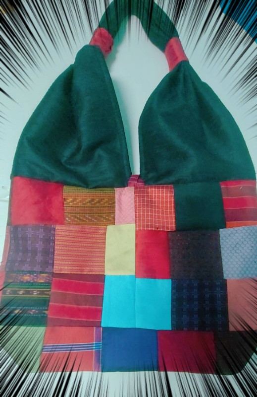 จากผ้าไหมที่เหลือจากการตัดเย็บ นำมาเย็บต่อกันให้ได้หลากสีสัน เพิ่มสเหน่ให้ผ้าไหมมีชีวิตชีวา ออกแบบตัดเย็บให้เป็นย่ามที่มีดีไซน์น่าใช้ ใส่ของได้สารพัดประโยชน์