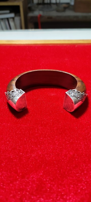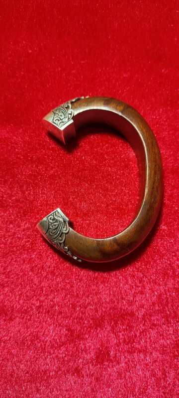 กำไลไม้มงคลประดับเงิน เป็นไม้พยุงซึ่งมีความเชื่อว่าจะช่วยพยุงทรัพย์ พยุงชีวิตให้เจริญก้าวหน้าทรัพย์สินเงินทองมีมาไม่ขาดหาย ประดับด้วยโลหะเงินแกะลวดลายกนกสวยงามและยังเป็นมงคลกับผู้สวมใส่ ขนาดไซด์ 6×4ซม.