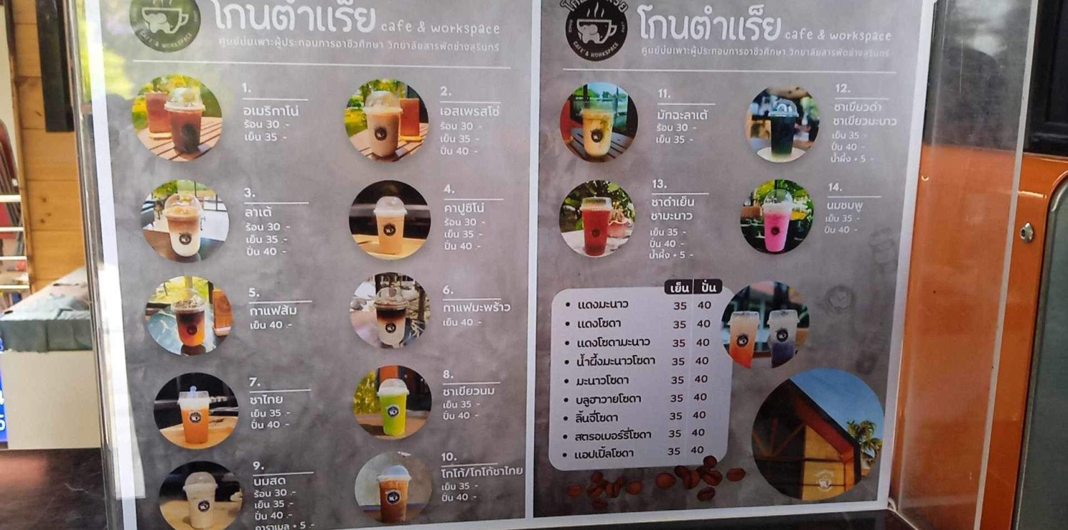 ร้านกาแฟโกนตำแร็ย มีเครื่องดื่มให้คุณเลือกหลากหลายเมนู ไม่ว่าจะเป็น เมนูชา เมนูกาแฟ เมนูสมูตตี้ รวมถึงผลิตภัณฑ์เบเกอรี่ อาหารและเครื่องดื่มต่างๆ พร้อมเสิร์ฟให้คุณลูกค้าถึงที่ มีบริการส่งฟรี หากสั่งซื้อ 10 แก้วขึ้นไป ระยะไม่เกิน 3 กิโลเมตร 044514414 หรือ ผ่านเฟสบุ๊ค โกนตำแร็ย Cafe & Workspace