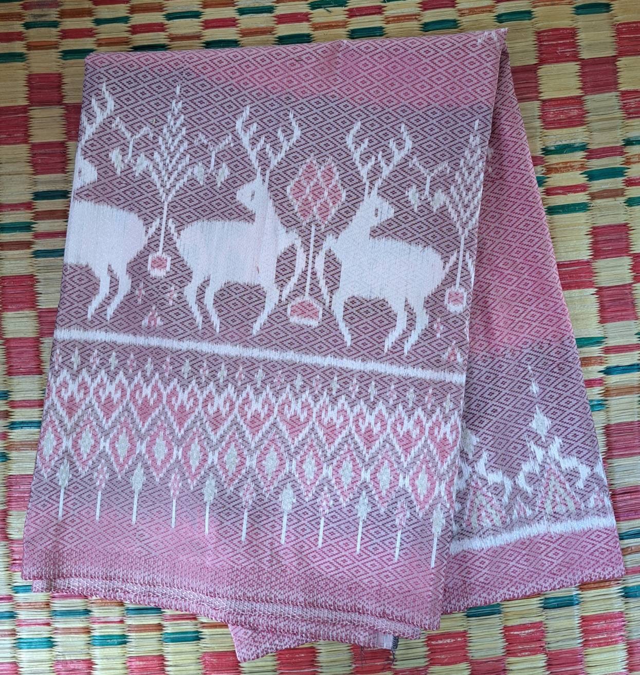ผ้าไหมมัดหมี่ ลายกวาง สีธรรมชาติ ย้อมครั่ง หมักคราม เครือสมอ ยอกดอกดอกเเก้ว ขนาด 1*2 เมตร 6 ตะกอ