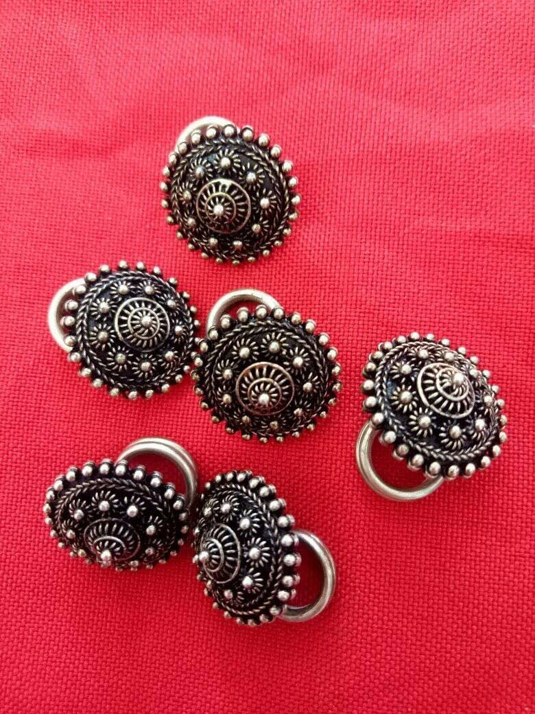 กระดุมมีความโบราณ ลักษณะคล้ายดอกไม้ มีลวดลายที่สวยงาม เป็นงานฝีมือ