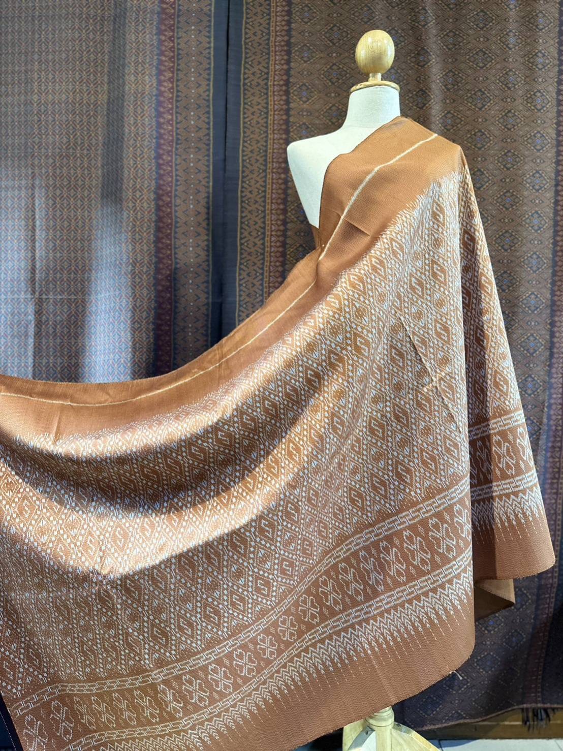 ผ้าไหมมัดหมี่ 3ตะกอทอมือฟีมมีโบราณ มัดหมี่ลายขิดนารี ทอสอดเครือหางกระรอกขนาด1×2เมตร