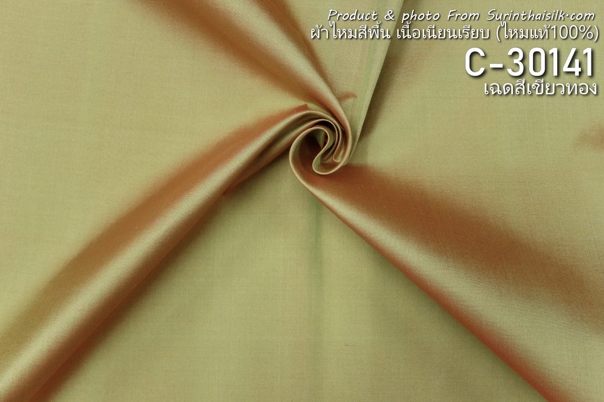 ผ้าไหมสีพื้น เนื้อเรียบ ไหมแท้ 2เส้น สีเขียวทอง ตัดขายเป็นหลา รหัส C-30141