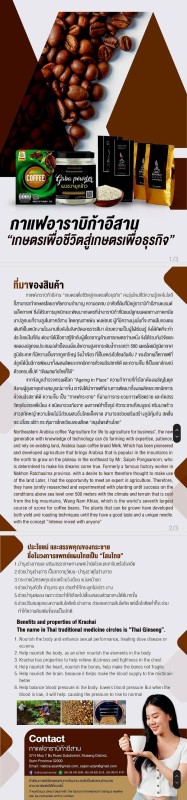 จากข้อมูลสำรวจยุคเทรนของโลก สังคมผู้สูงอายุอย่างสมบรูณ์มากขึ้นเราจึงได้นำกาแฟที่ผ่านการพัฒนาทั้งผลผลิตและเทคนิคการคั่ว บด จนมีรสชาติดี ความเข้ม มาเป็น กาแฟกระชาย ที่ผ่านกระบวนการฟรีซดรายและคัดสรรวัตถุดิบเกรดพีเมี่ยม 4 ชนิด มารวมกันจากผงกาแฟสำเร็จรูป หัวกระชายที่สมบรูณ์ ครีมมะพร้าว สารสกัดหญ้าหวาน โดยไม่มีส่วนผสมอื่นโดยเด็ดขาด สามารถช่วยเสริมภูมิคุ้มกัน สดชื่น กระปรี้กระเปร่า กระตุ้นการไหลเวียนของเลือด "สมุนไพรต้านโลก" ช่วยต้านไวรัสโควิค