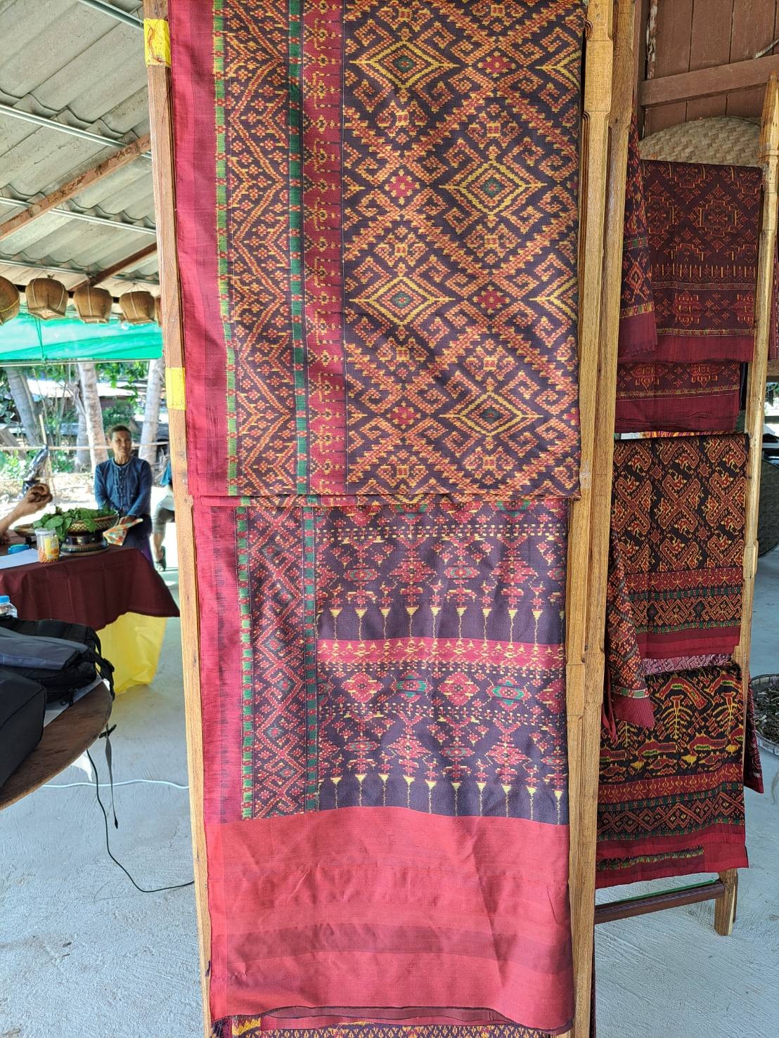 ผ้าไหมมัดหมี่ ยกดอกเม็ดพริกไทย ลายนาคตีนตะขาบ 3 ตะกอ ขนาด 1*4 เมตร สีเคมี จากกลุ่มทอผ้าไหมบ้านหมื่นชัย อำเภอสังขะ จังหวัดสุรินทร์