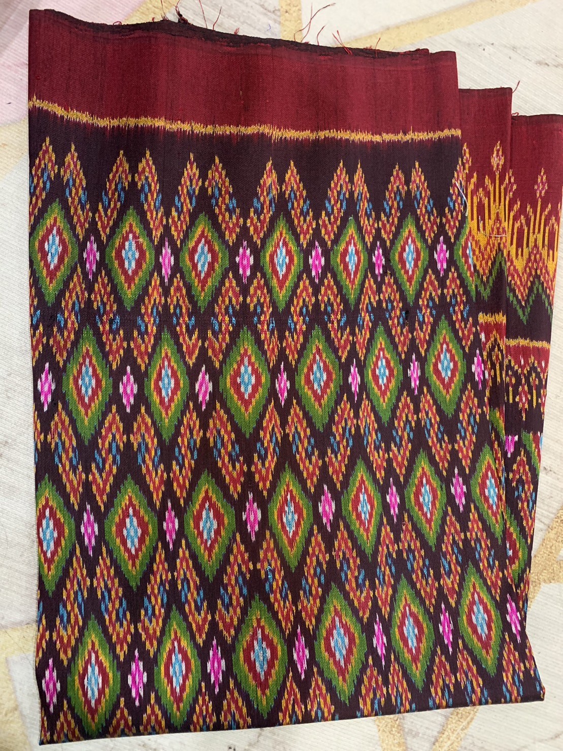 ผ้าไหมลายมัดหมี่ 3 ตะกอ ทอจากภูมิปัญญา มีความนุ่ม พริ้ว เนื้อแน่น สวยงาม ย้อมด้วยสีเคมี