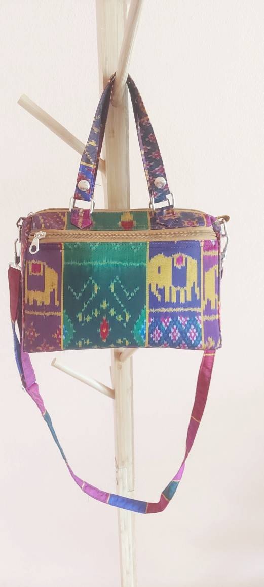 กระเป๋าผ้าไหมแท้ ทรงกล่อง มี 3ช่อง มีซิปมีซับตัดเย็บโดยทีมช่างฝีมือประณีต สายกระเป๋าแบบสั้น และ แบบสะพายปรับสายได้ตามต้องการ ออกแบบดีไซน์ทันสมัยเก๋ไก๋ ใช้ผ้าไทยให้สนุก ในลุคที่มีสไตล์