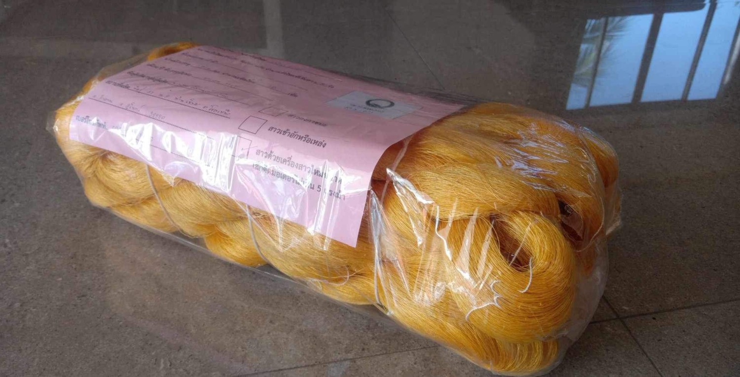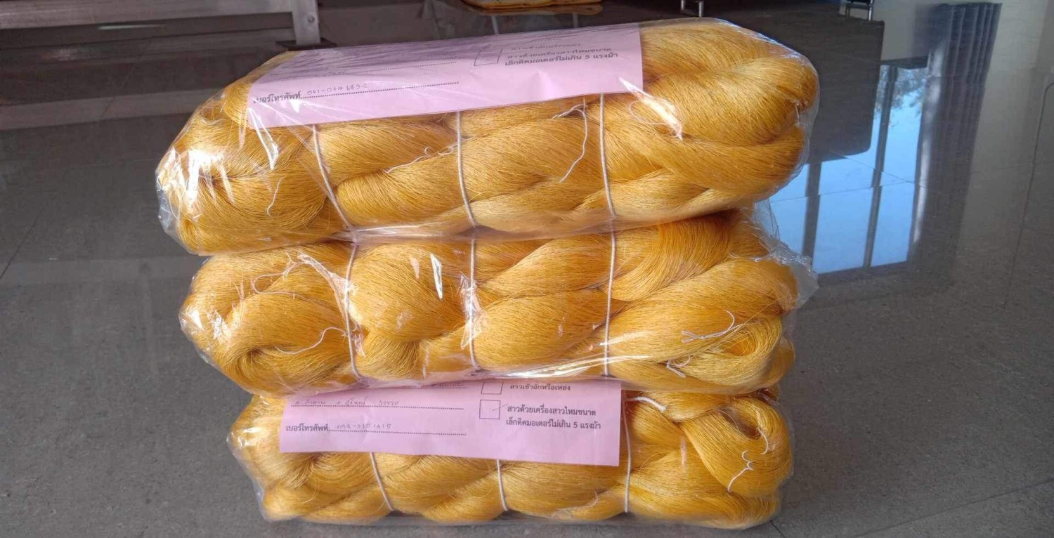 เส้นไหมที่ได้จากหม่อนไหมพื้นบ้านพันธุ์ผสม(เหลืองสระบุรี) เป็นเส้นไหมที่สาวเอง(ไหมเลย)
