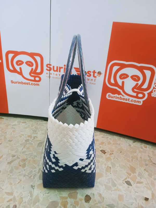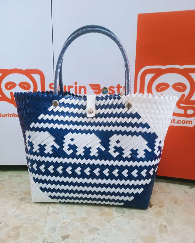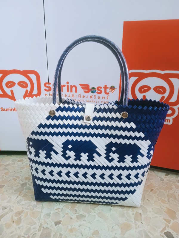 กระเป๋าลายช้างน้อย สานจากเส้นสานพลาสติกรีไซเคิลเกรดเอ มีความสวยงาม ทนทาน บรรจุของรับน้ำหนักได้ดี มีลายเป็นเอกลักษณ์