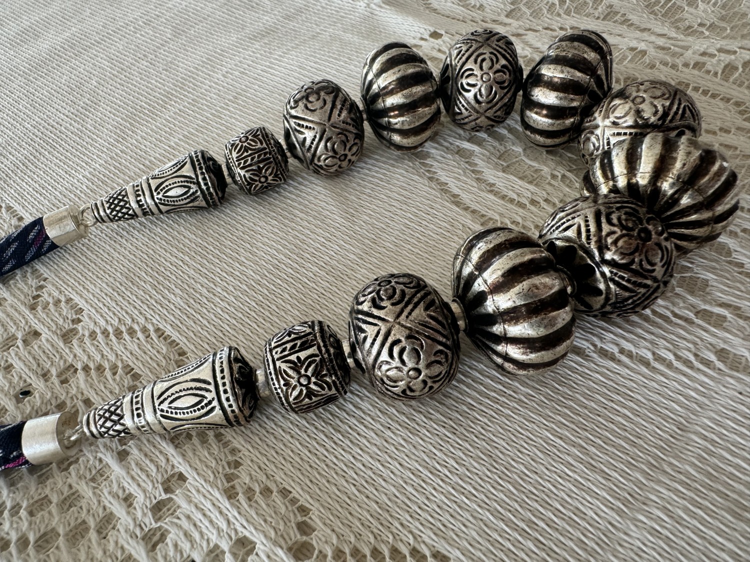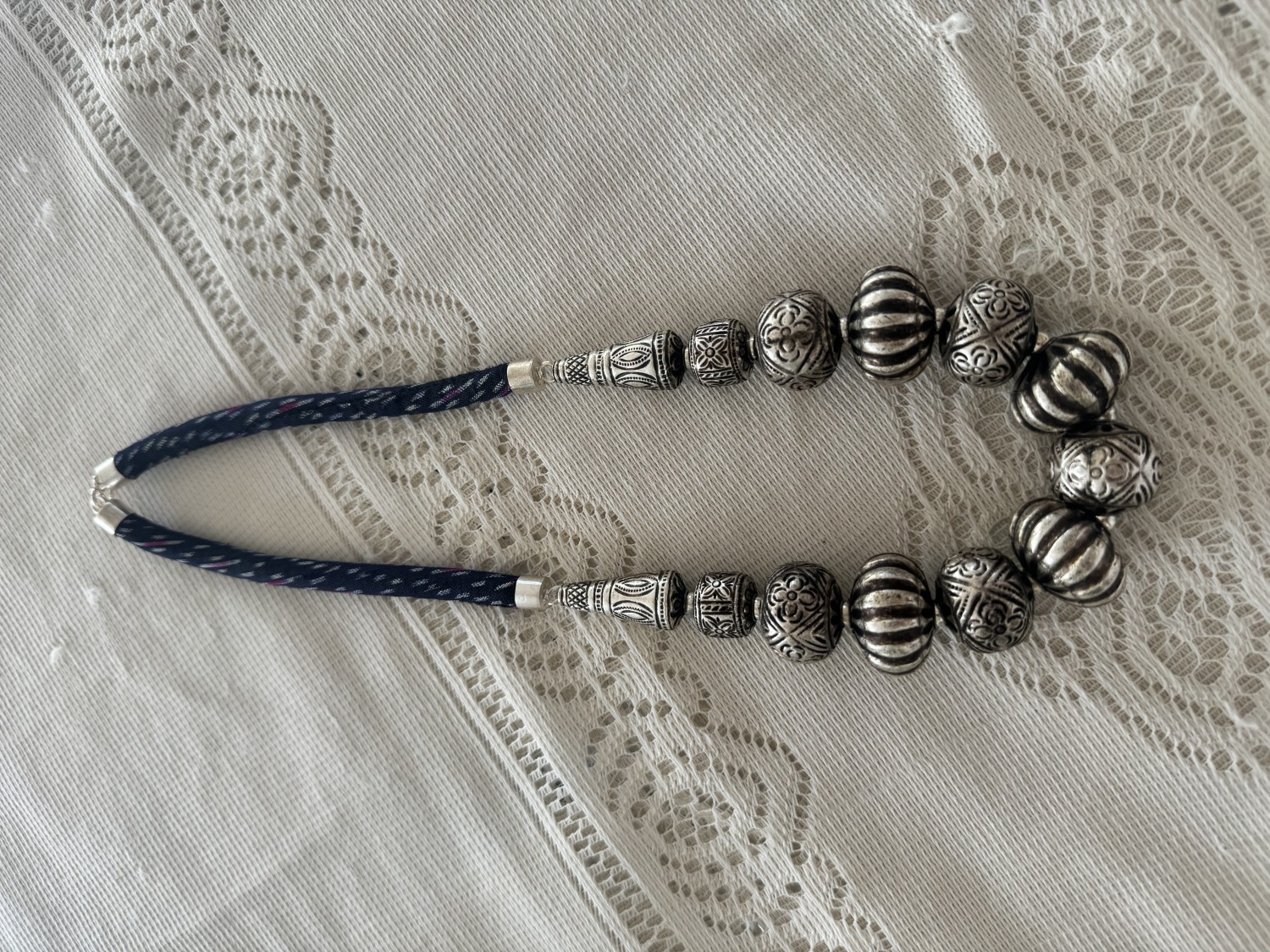 สร้อยคอผ้าไหมที่ประสมประสานระหว่างผ้าไหมกับเครื่องเงินมาประยุกต์ใช้ด้วยกัน ลายเม็ดประคำเป็นลายมะยม