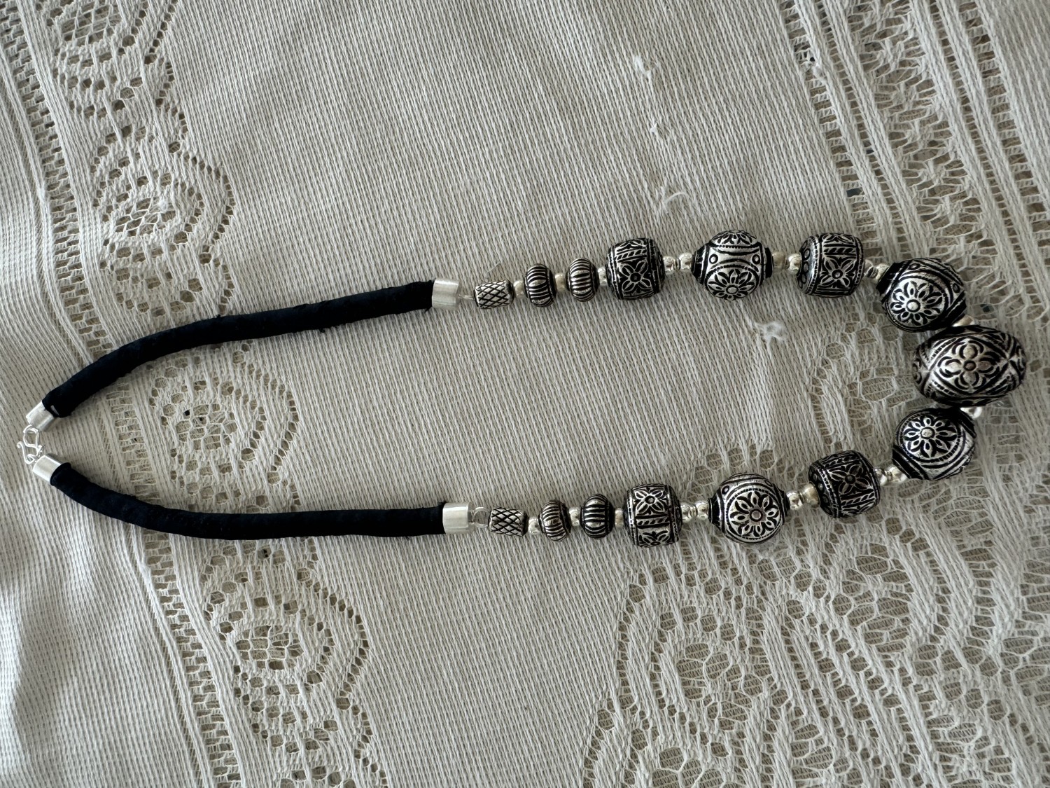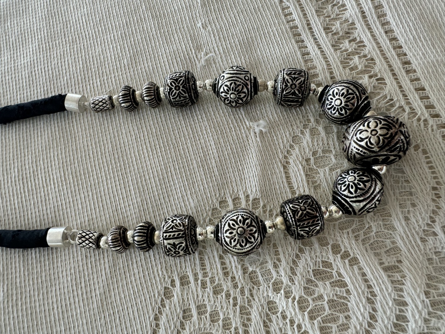 สร้อยประดับ เครื่องแต่งกาย เป็นสร้อยคอประยุกต์ที่รวมตัวผ้าไหมกับเครื่องเงินเม็ดประคำลายโบราณ