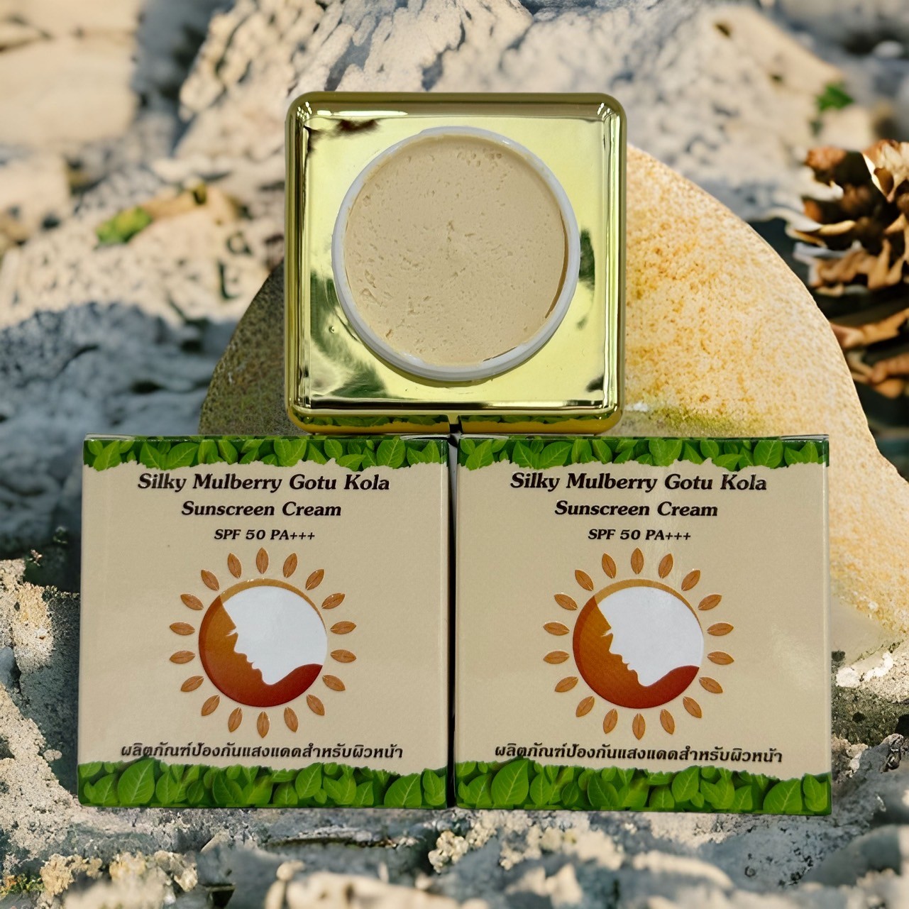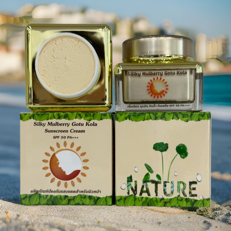 ปกป้องขั้นสุดพร้อมบำรุงในหนึ่งเดียว #ด้วยสารสกัดจากใบบัวบกและ ใบหม่อน พร้อมสารสกัดสมุนไพรอีก นานาชนิด #เติมคอลลาเจนให้ผิวสู่ผิวสดใสที่แท้จริง Silky Mulberry Gotu Kola SPF50 PA+++ ครีมกันแดดทรงประสิทธิภาพสำหรับผิวหน้าและลำคอ ️ป้องกันผิวจากแสงแดดและมลภาวะ️ช่วยกระตุ้นการสร้างคอลลาเจนและอีลาสตินในชั้นผิว️ชะลอการเกิดริ้วรอยเหี่ยวย่นที่เกิดตามวัย️เก็บรักษาความอ่อนเยาว์และความสดใสให้กับผิวลดการเกิดฝ้า อย่างมีประสิทธิภาพ
