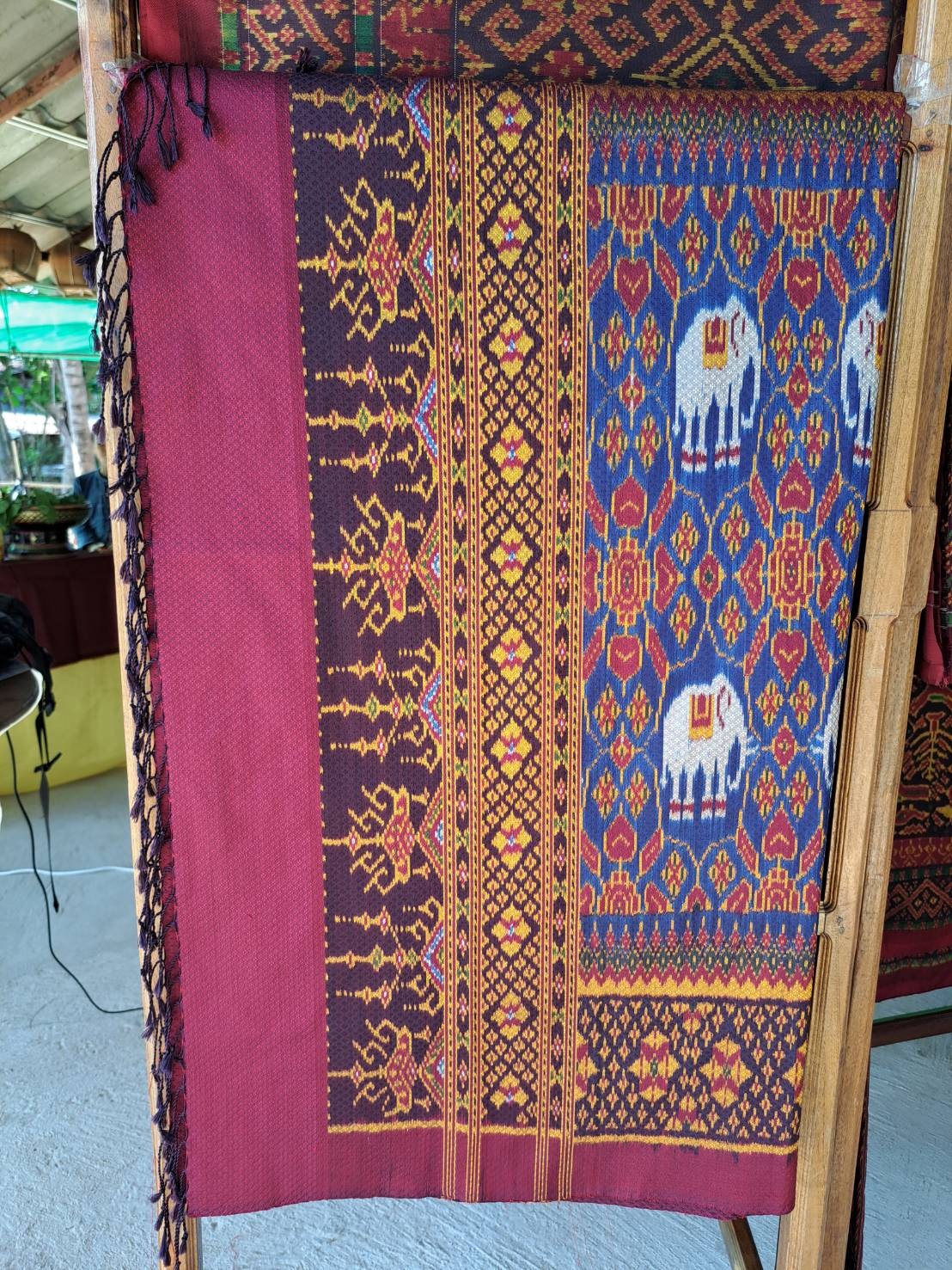 ผ้าไหมมัดหมี่ ยกดอกเม็ดพริกไทย ลายช้าง 5 ตะกอ ขนาด 1*2 เมตร ราคา 4500 บาท จากกลุ่มทอผ้าไหมบ้านหมื่นชัย อำเภอสังขะ จังหวัดสุรินทร์
