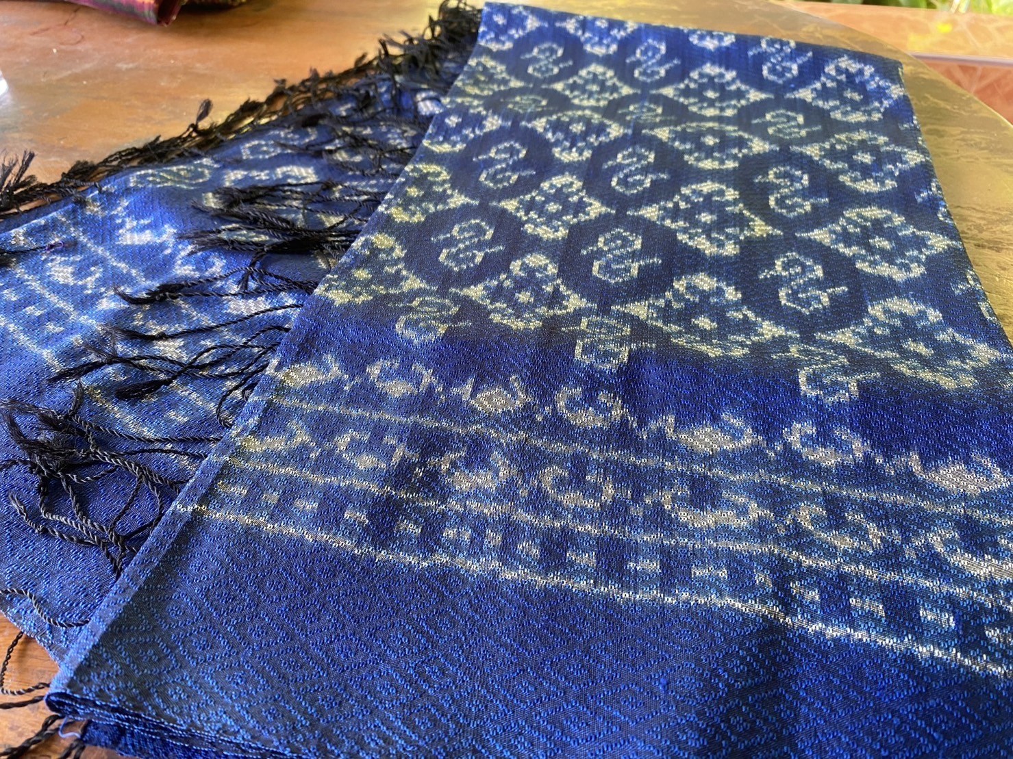 ผ้าไหมลายดอกรักราชกัญญา ยกดอก5ตะกอ ย้อมด้วยสีธรรมชาติจากคราม มีหน้านางชายครุย ไหมพื้นเมือง เนื้อแน่น มีความสวยงาม