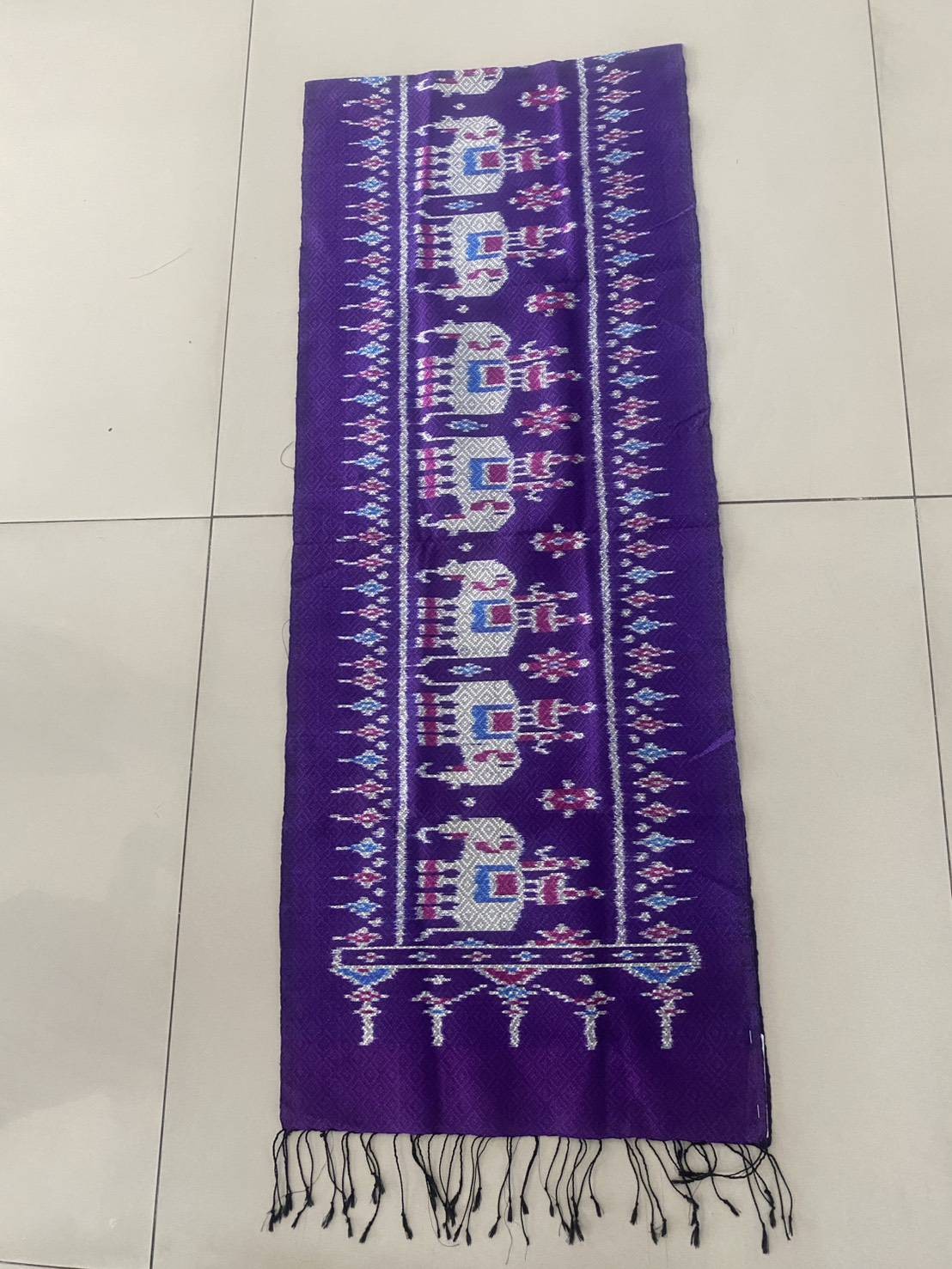 ผ้าพันคอลายช้างสีม่วง ยกดอกลายลูกแก้ว 5 ตะกอ ขนาดผ้า 38*180 ซ.ม.