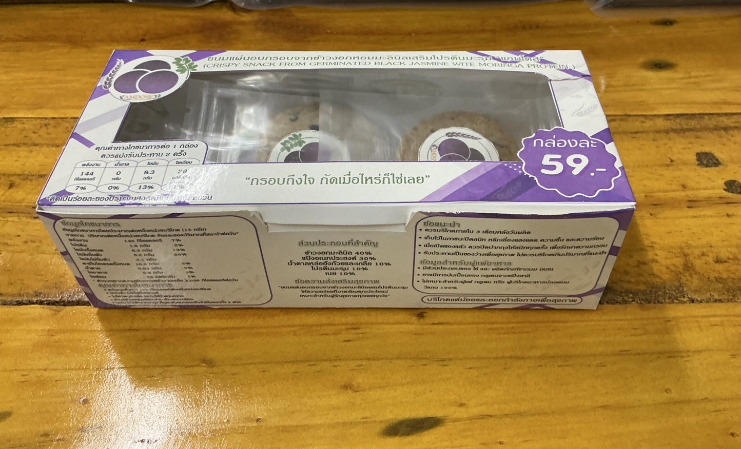 ขนมแผ่นอบกรอบจากข้าวหอมมะลินิลเสริมโปรตีนมะรุม อุดมไปด้วยสารอาหารที่มีประโยชน์ต่อร่างกาย มีสรรพคุณและสารอาหารทางโภชนาการ ตอบโจทย์สำหรับคนที่มองหาขนมที่ทานแล้วได้ประโยชน์ต่อร่างกาย และรักษาสุขภาพ เป็นอย่างดี