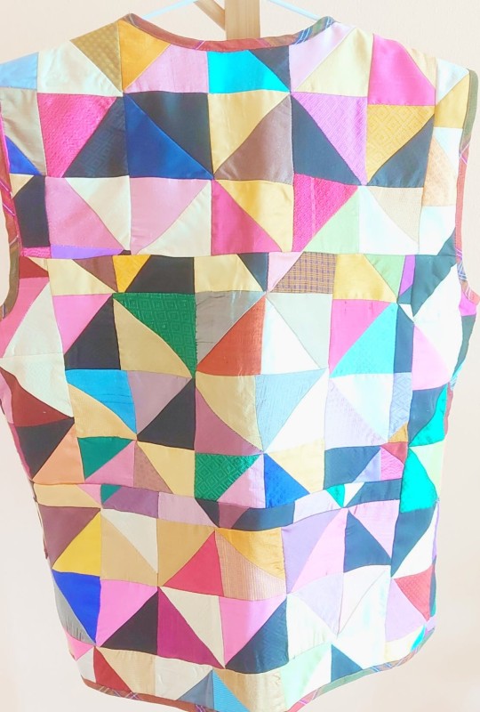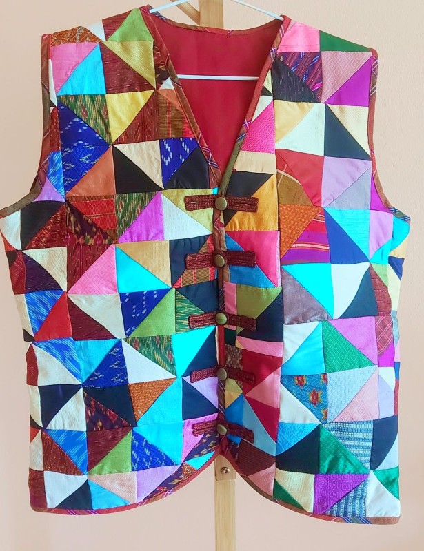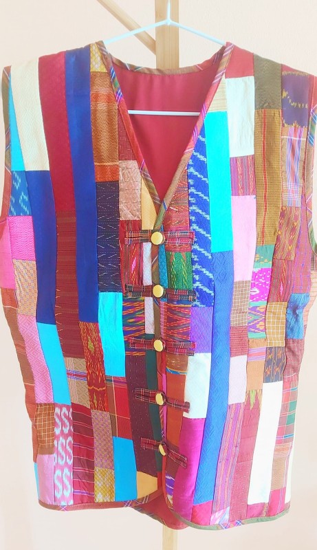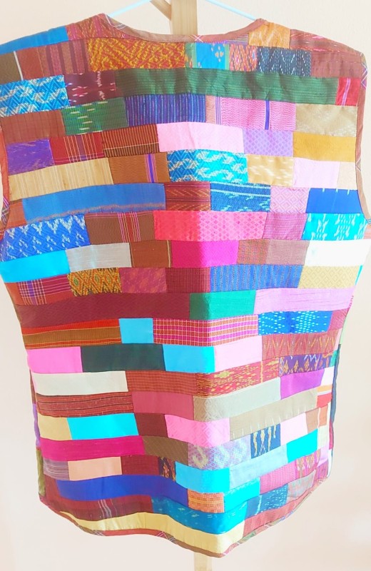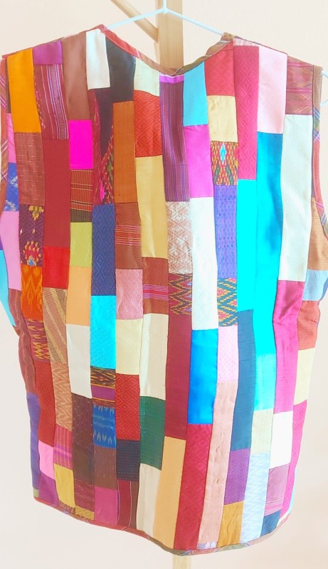 จากเศษผ้าไหมที่เหลือจากการตัดเย็บ นำมาประดิษฐ์ออกแบบ ตัดต่อผ้าไหมให้ได้หลากหลายลวดลายและสีสันเป็นการเพิ่มมูลค่าจากวัสดุเหลือใช้ โดยนำมาตัดเย็บเป็นเสื้อคลุมผ้าไหม ต่อลาย ที่มีสีสันสดใส ใส่ได้ทั้งชายและหญิง