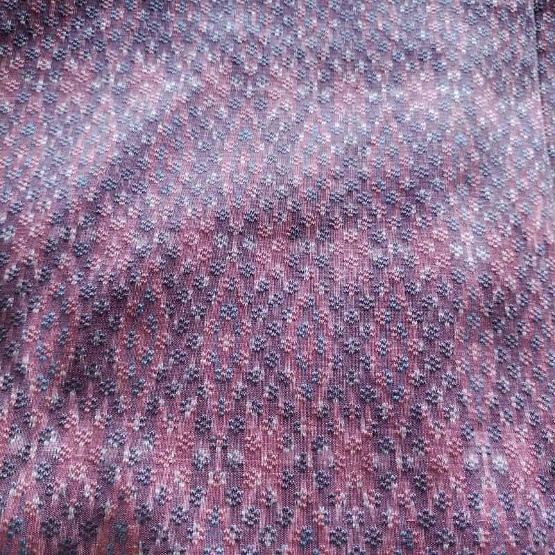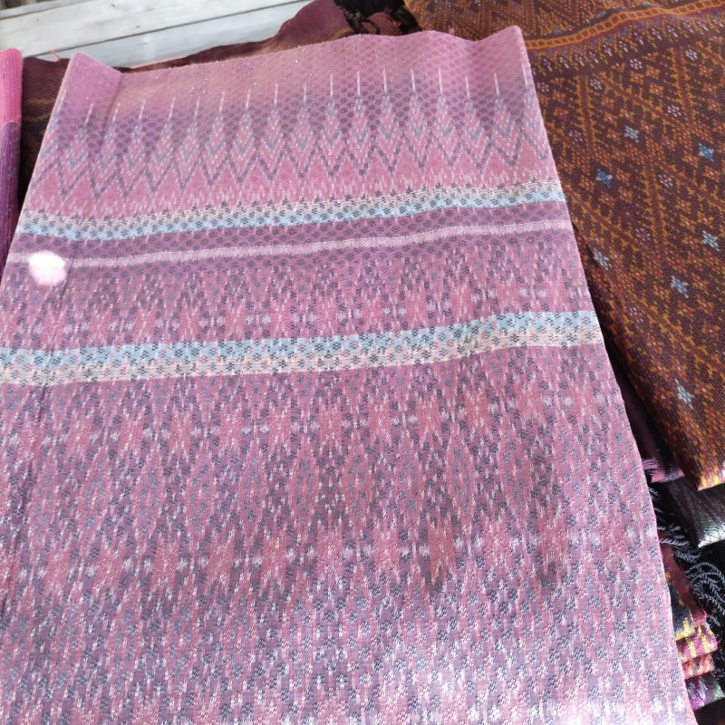 ผ้าไหมมัดหมี่สีธรรมชาติลายดอกกันเกรายกดอกพิกุล 6 ตะกอ สีธรรมชาติย้อมด้วยคลั่ง คราม ทอด้วยไหมจุนทั้งเส้นพุ่งและเส้นยืน