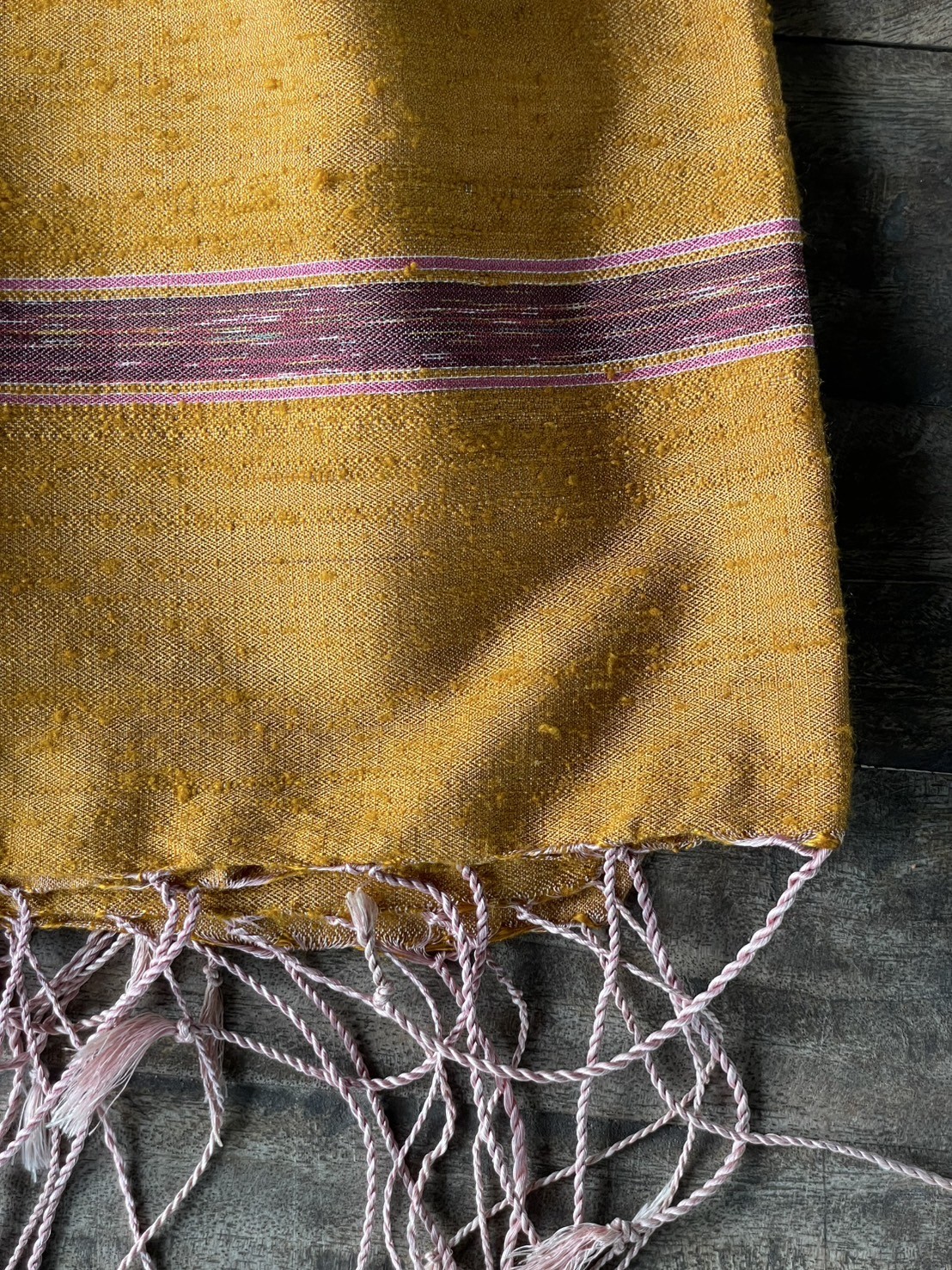 มีลักษณะโดดเด่น ที่ลวดลายและสีสัน ของการทอแบบมัดหมี่ วัตถุดิบใช้เส้นไหมบ้าน