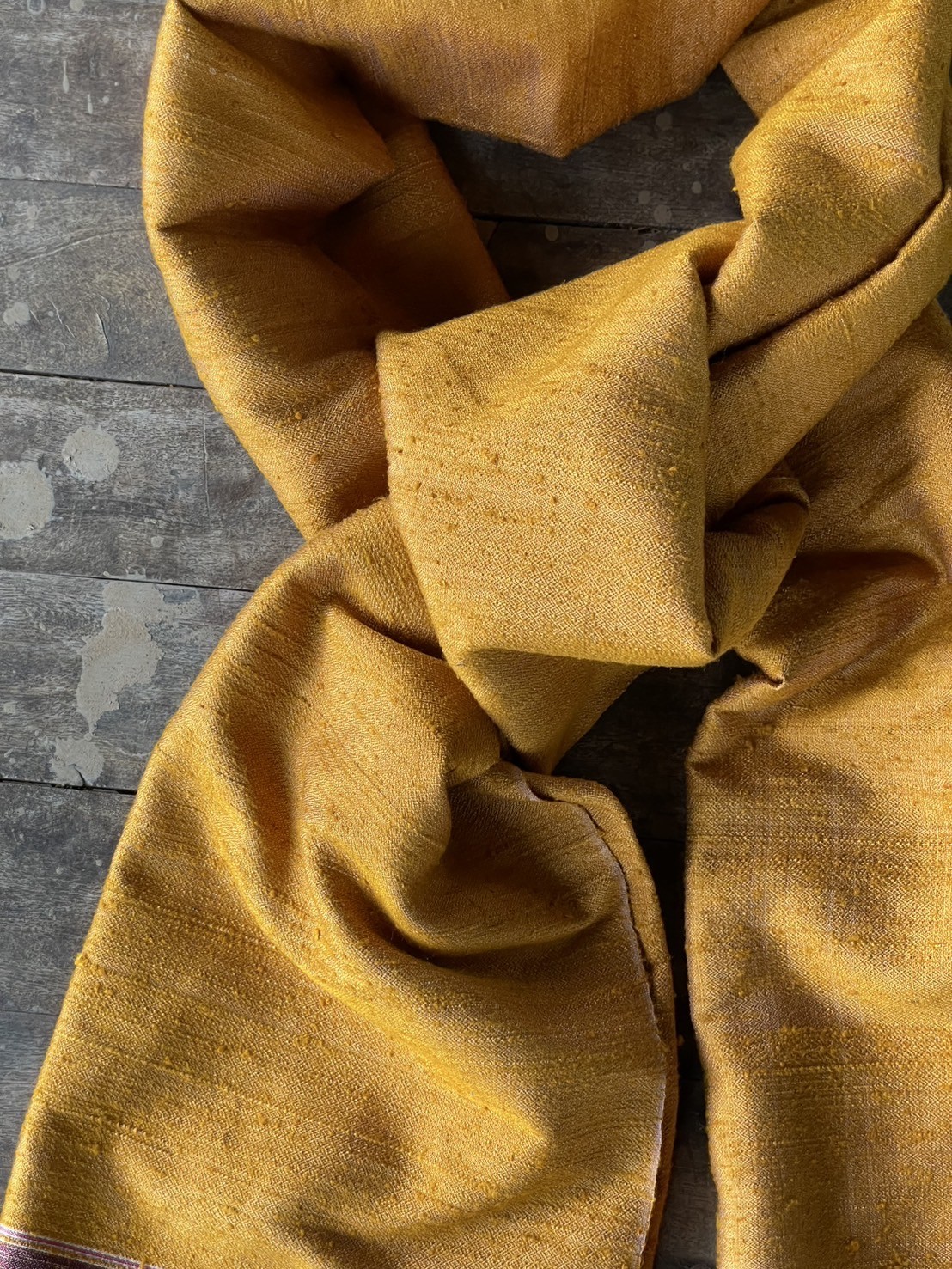 สีของเส้นไหมมีความเหลือบเงา ผ้าผืนเดียวกันสามารถเห็นสีได้หลากหลายขึ้นอยู่กับค่าแสงในขณะนั้น สีจริงอาจต่างจากภาพประมาณ 5-10% แนะนำชมภาพสินค้าผ่านหน้าจอมือถือ ค่อนข้างใกล้เคียงสีของผ้าจริง