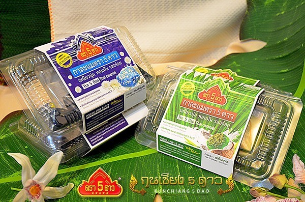 กาละแม"ใบเตย" ตรา5ดาวผลิตจากหัวกะทิสดข้นๆและใบเตยคั้นสดๆหอมๆ เนื้อสัมผัสที่เหนียวหนึบด้วยเทคนิคพิเศษที่ตรา5ดาวได้รังสรรค์ซึ่งเป็นสูตรลับเฉพาะไม่เหมือนใคร