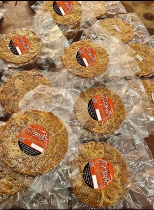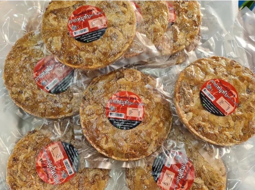 กากหมูทับ สินค้าท้องถิ่นสุรินทร์ ทำการมันหมูทอดกรอบ เอามากดใส่พิมพ์กลม แพ๊คสูญญากาศอย่างดี ทานกับส้มตำ ก๋วยเตี๋ยว หรือทานเล่นได้เลย ใครยังไม่เคยทานต้องลอง น้ำหนัก230กรัม