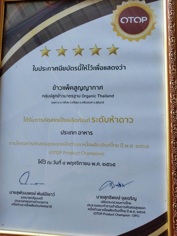 เป็นข้าวหอมมะลิที่ได้จากแปลงนาอินทรีย์ โดยการใช้เชื้อไตรโคเดอร์มาในการกำจัดเชื้อรา ป้องกันโรคไหม้คอรวง ปุ๋ยได้มาจากการไถกลบตอซังและหว่านปอเทือง เพื่อให้เป็นปุ๋ยพืชสด ใช้น้ำหมักชีวภาพในการบำรุงต้นข้าว และฉีดฮอร์โมนไข่ในระยะก่อนข้าวออกรวง 1 เดือน เก็บเกี่ยวในระยะพลับพลึง สีข้าวโดยให้จมูกข้าวยังติดอยู่กับเมล็ดเพื่อเพิ่มคุณค่าทางโภชนาการ