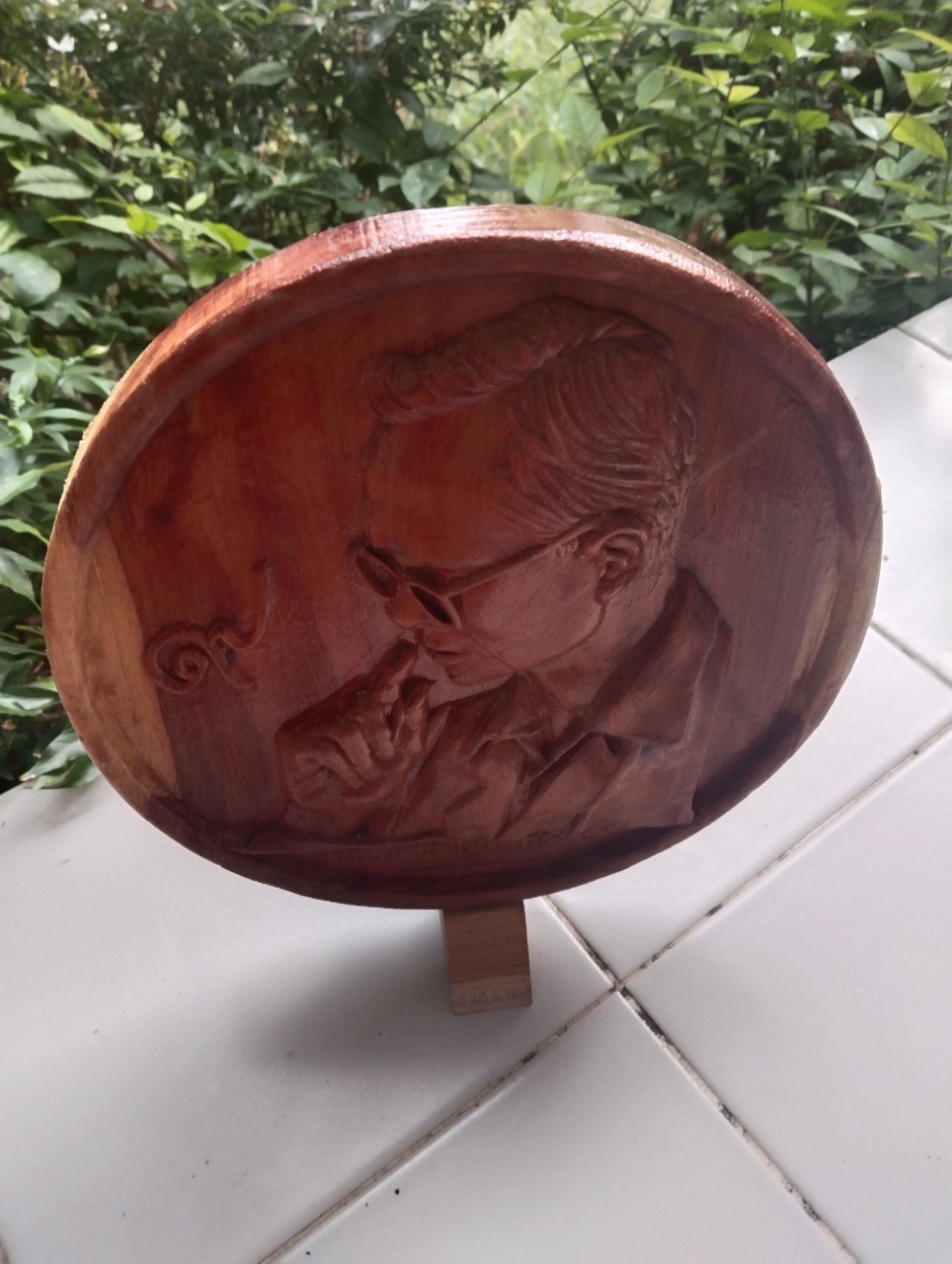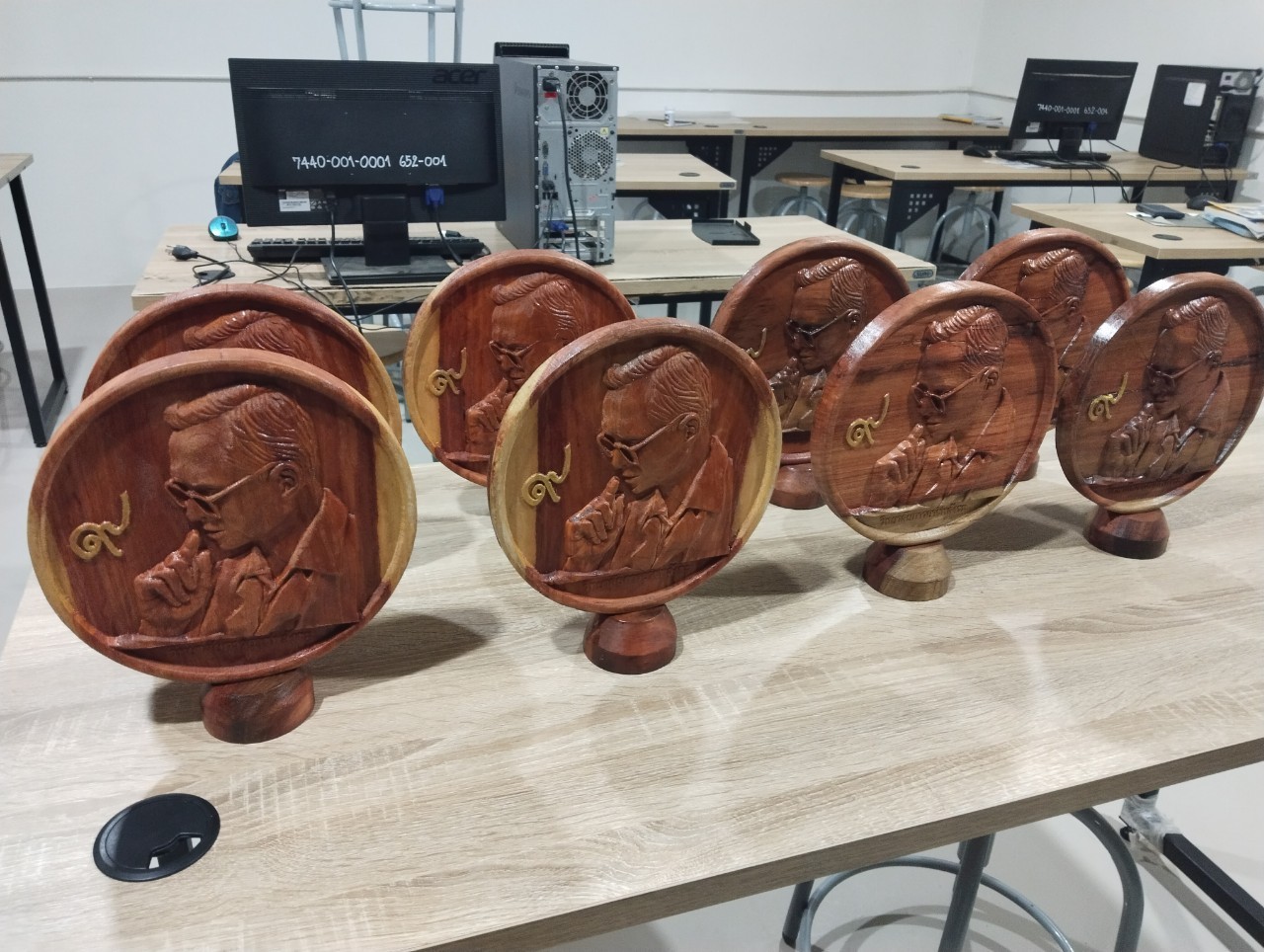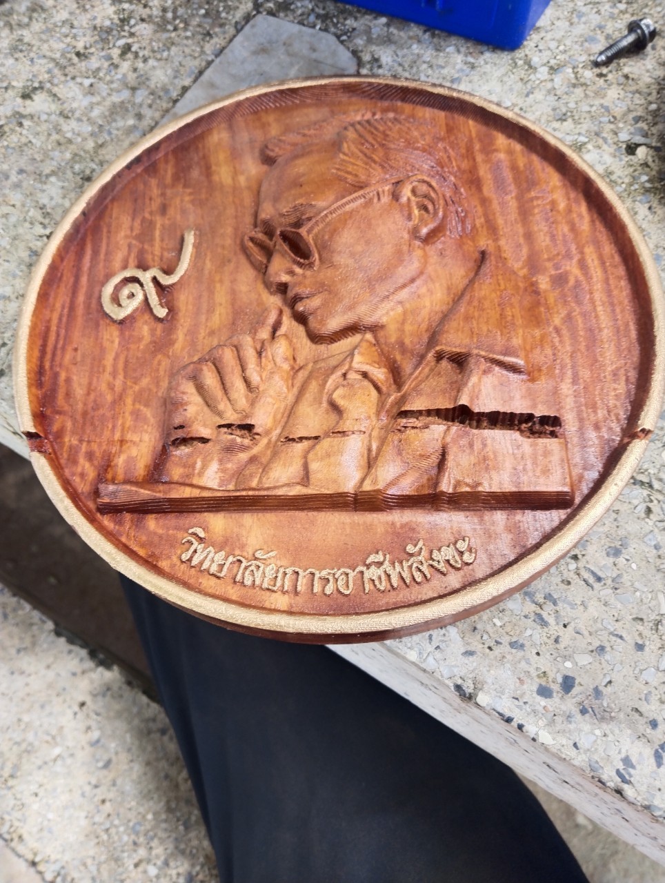 งานไม้สัก  แกะสลักด้วยเครื่อง CNC เป็น รูป รัชการ ที่ 9  ประดับตกแต่งด้วยดอกไม้รังไหม