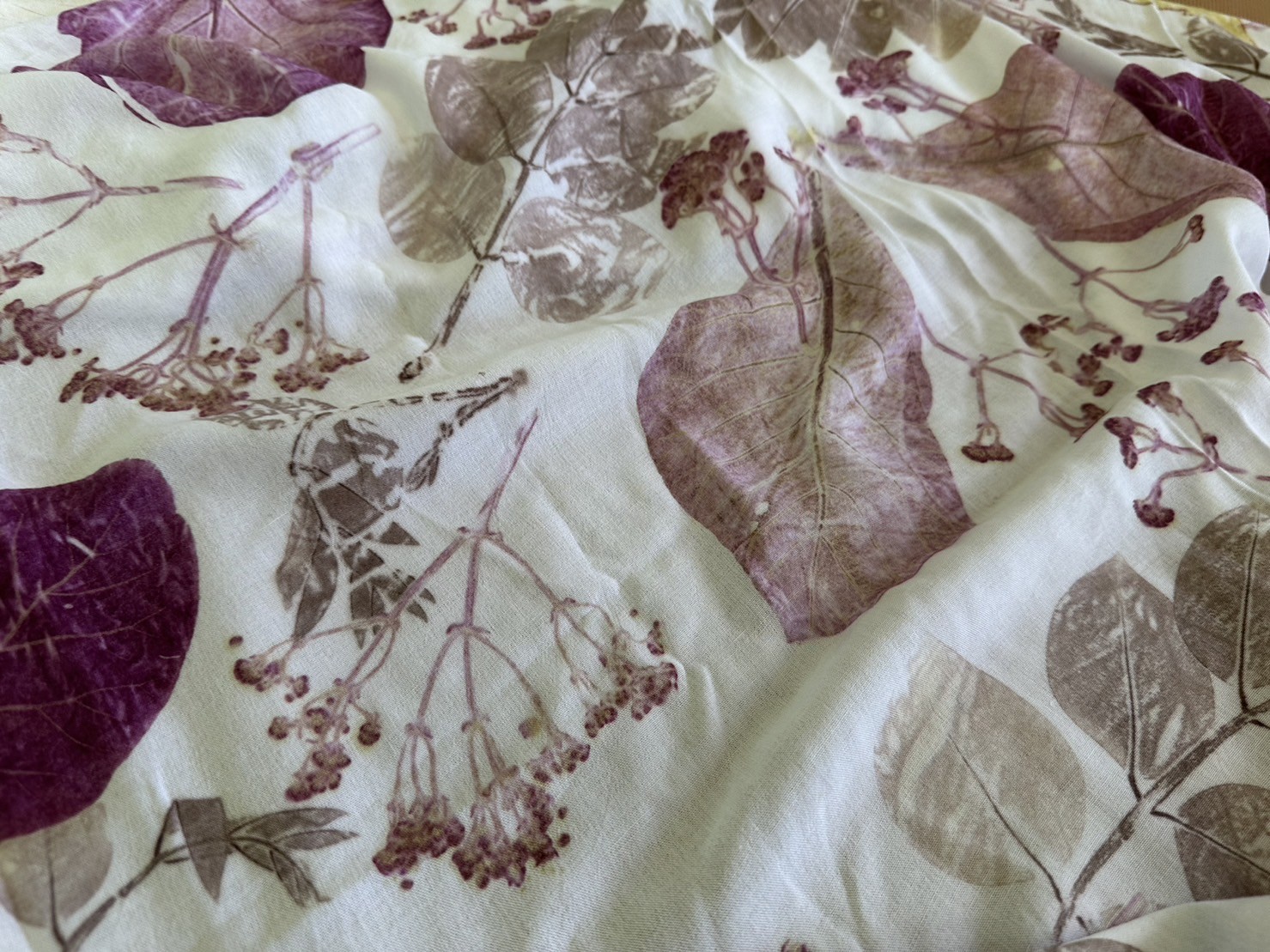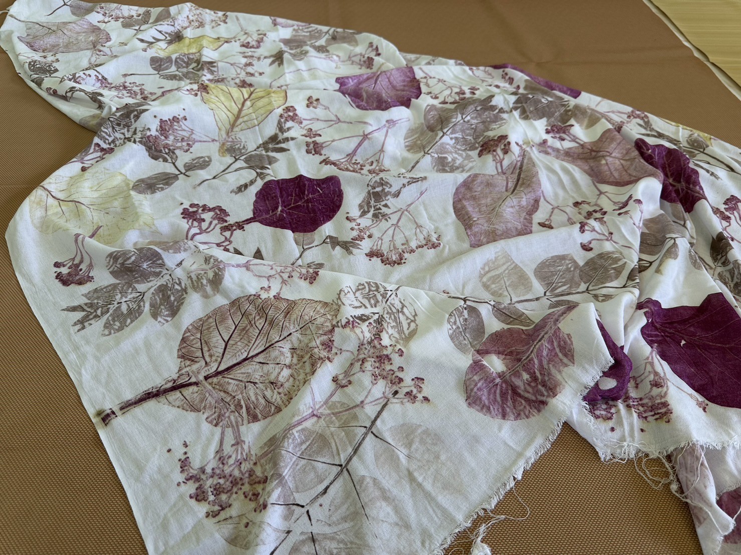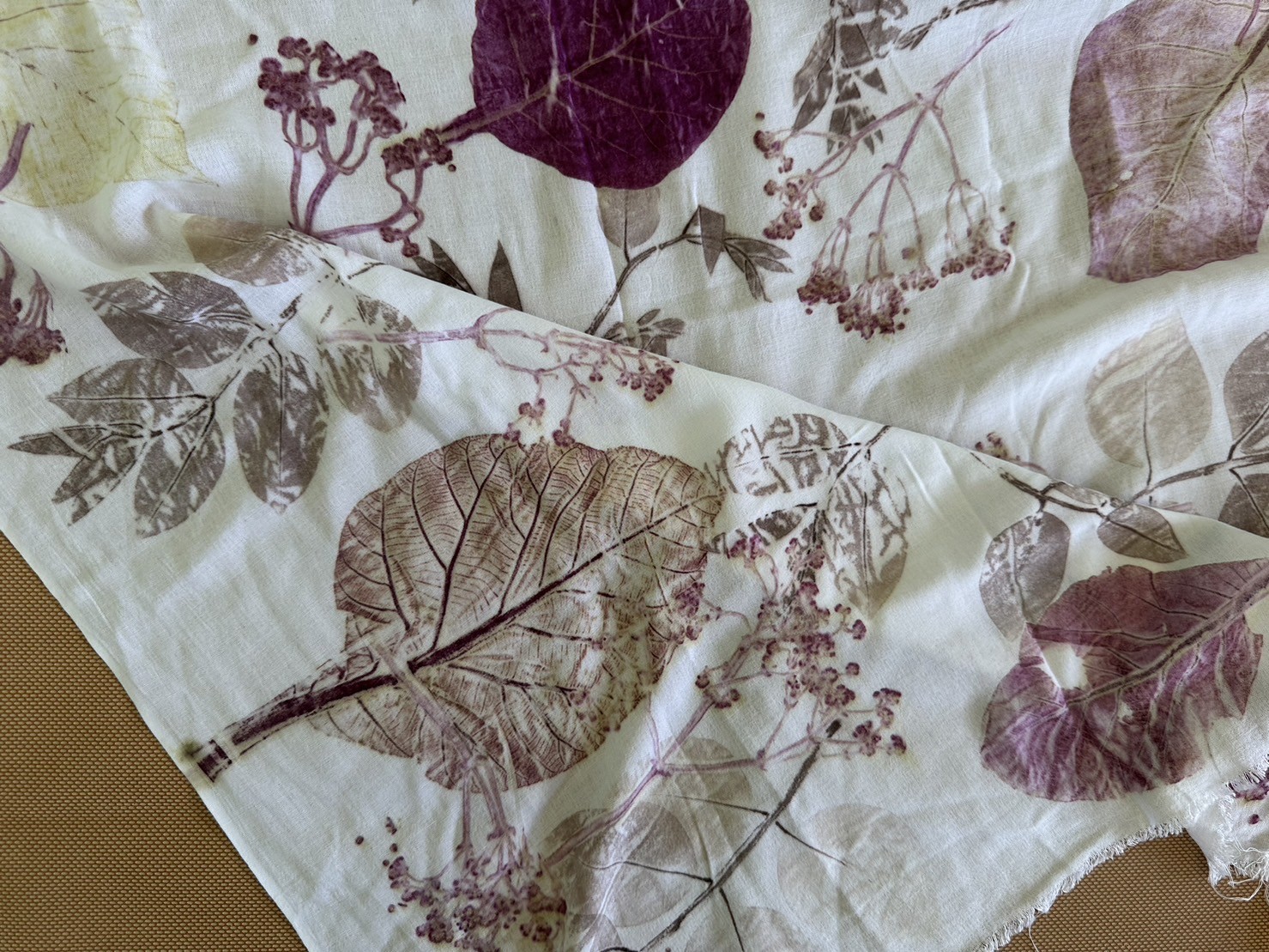ผ้าลีนิน Eco print สำหรับนำไปตัดเสื้อผ้าและอื่นๆ ยาว 165 ซม. กว้าง 150 ซม. มีลักษณะพิเศษที่ไม่เหมือนใคร มีหนึ่งเดียวในโลก ลวดลายเกิดจากการเอาใบไม้ใบต่างๆ มาจัดเรียงเป็นลวดลายที่สวยงาม