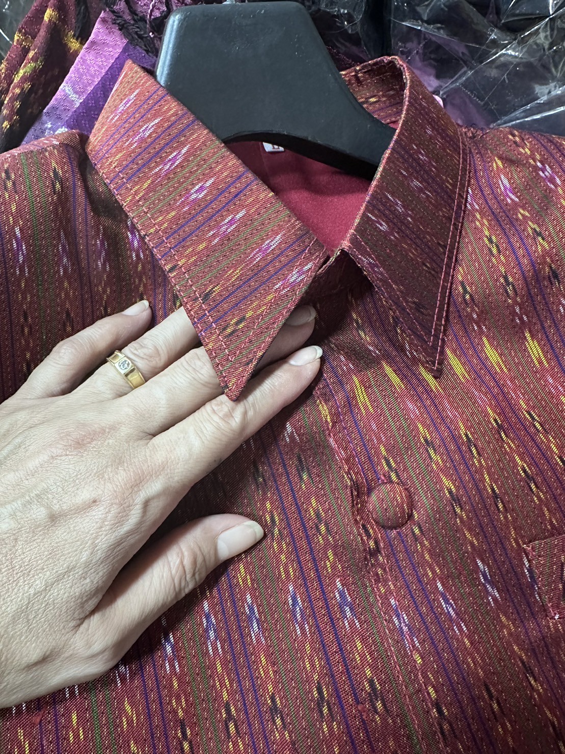 ?เสื้อสูทผู้ชาย ไซส์ L ตัดเย็บด้วยผ้าไหมมัดหมี่ลายโฮล "ราชินีผ้าไหมสุรินทร์" ซึ่งถือเป็นผ้าไหมลายอัตลักษณ์ ของจังหวัดสุรินทร์
